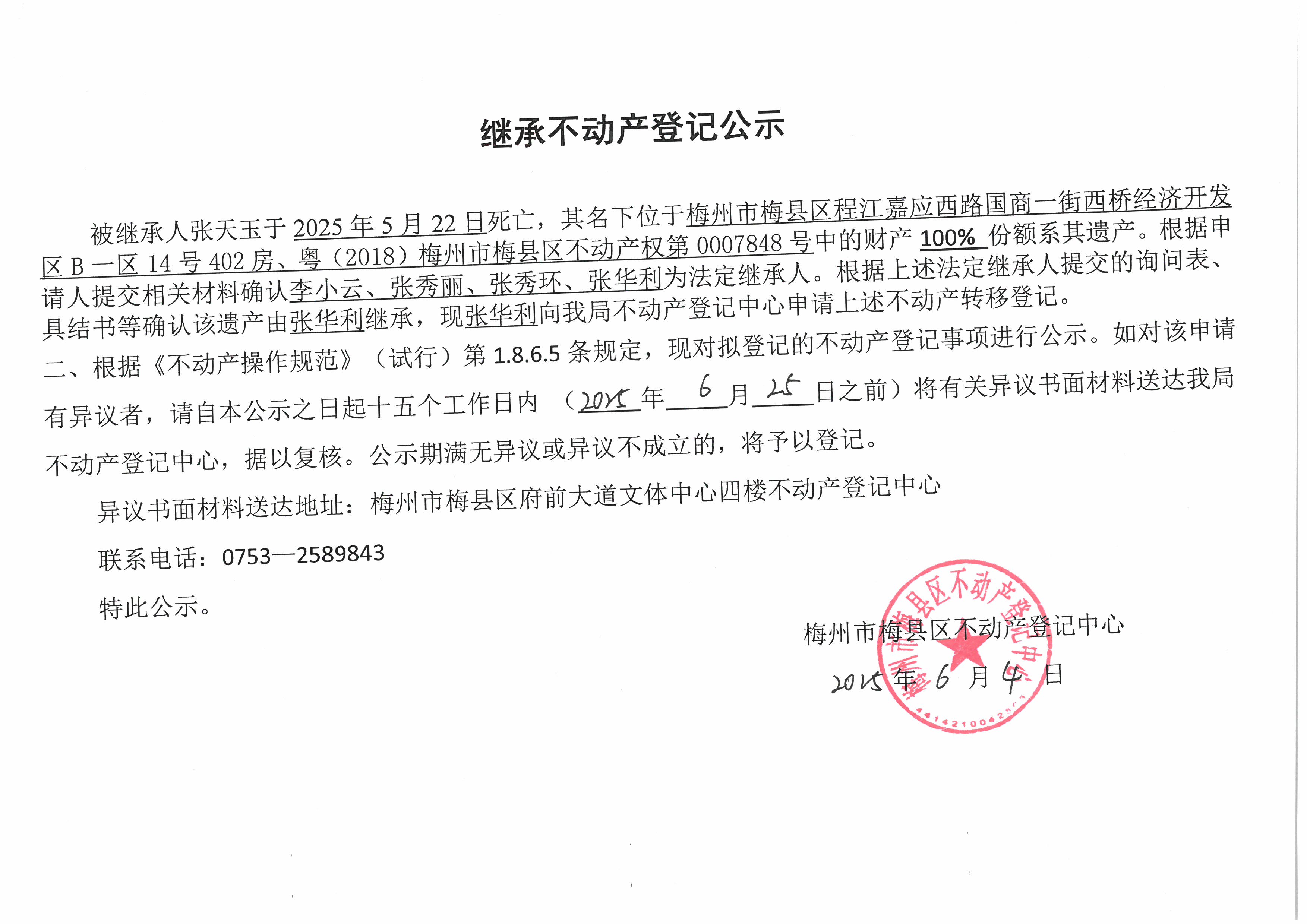 被继承人张天玉于2025年5月22日死亡,其名下位于梅州市梅县区程江嘉应西路国商一街西桥经济开发区B一区14号402房、粤(2018)梅州市梅县区不动产权第0007848号中的财产100%份额系其遗产。根据申请人提交相关材料确认李小云、张秀丽、张秀环、张华利为法定继承人。根据上述法定继承人提交的询问表、具结书等确认该遗产由张华利继承,现张华利向我局不动产登记中心申请上述不动产转移登记。