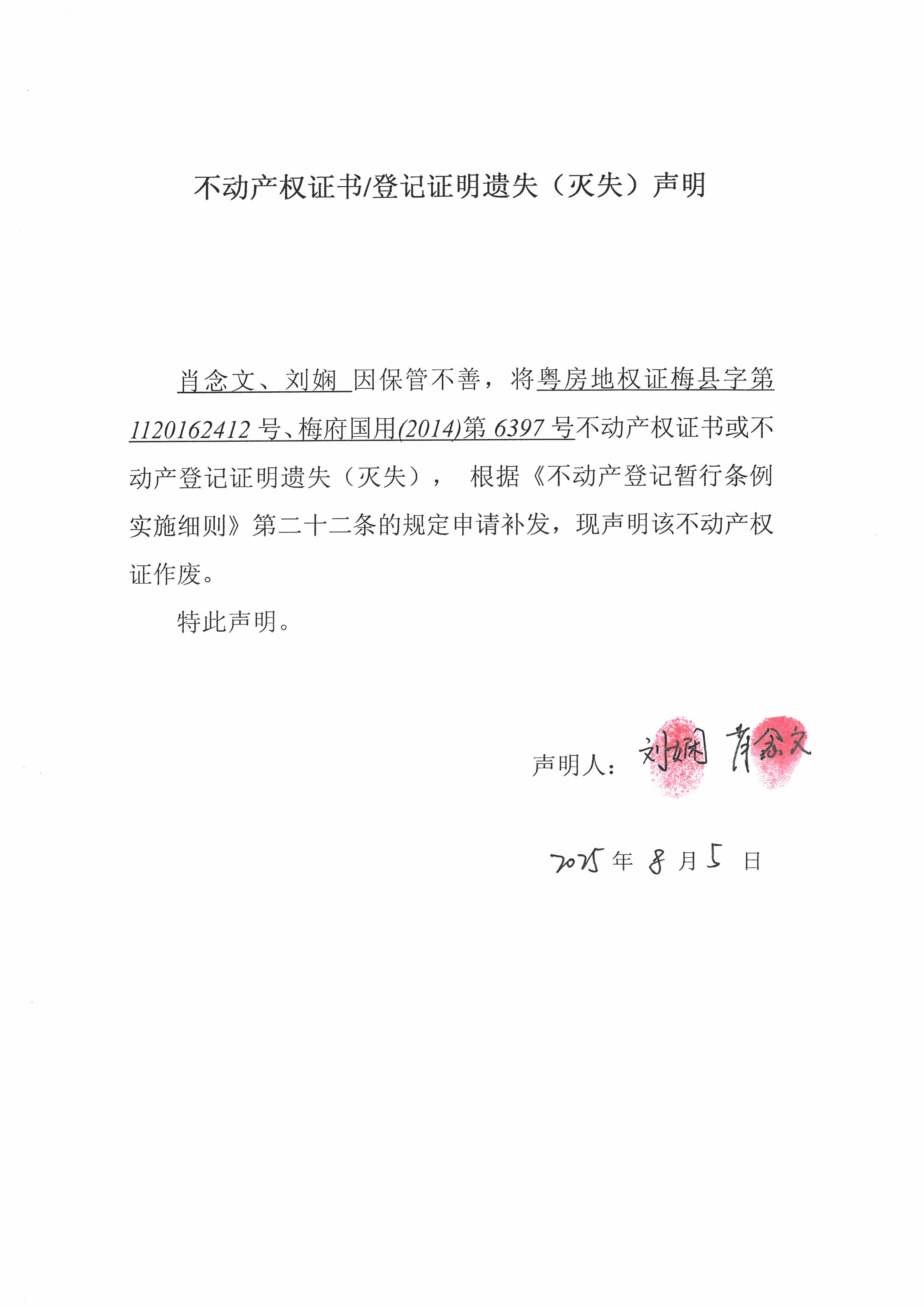 肖念文、刘娴因保管不善,将粤房地权证梅县字第1120162412号、梅府国用(2014)第6397号不动产权证书或不动产登记证明遗失(灭失),根据《不动产登记暂行条例实施细则》第二十二条的规定申请补发,现声明该不动产权证作废。
