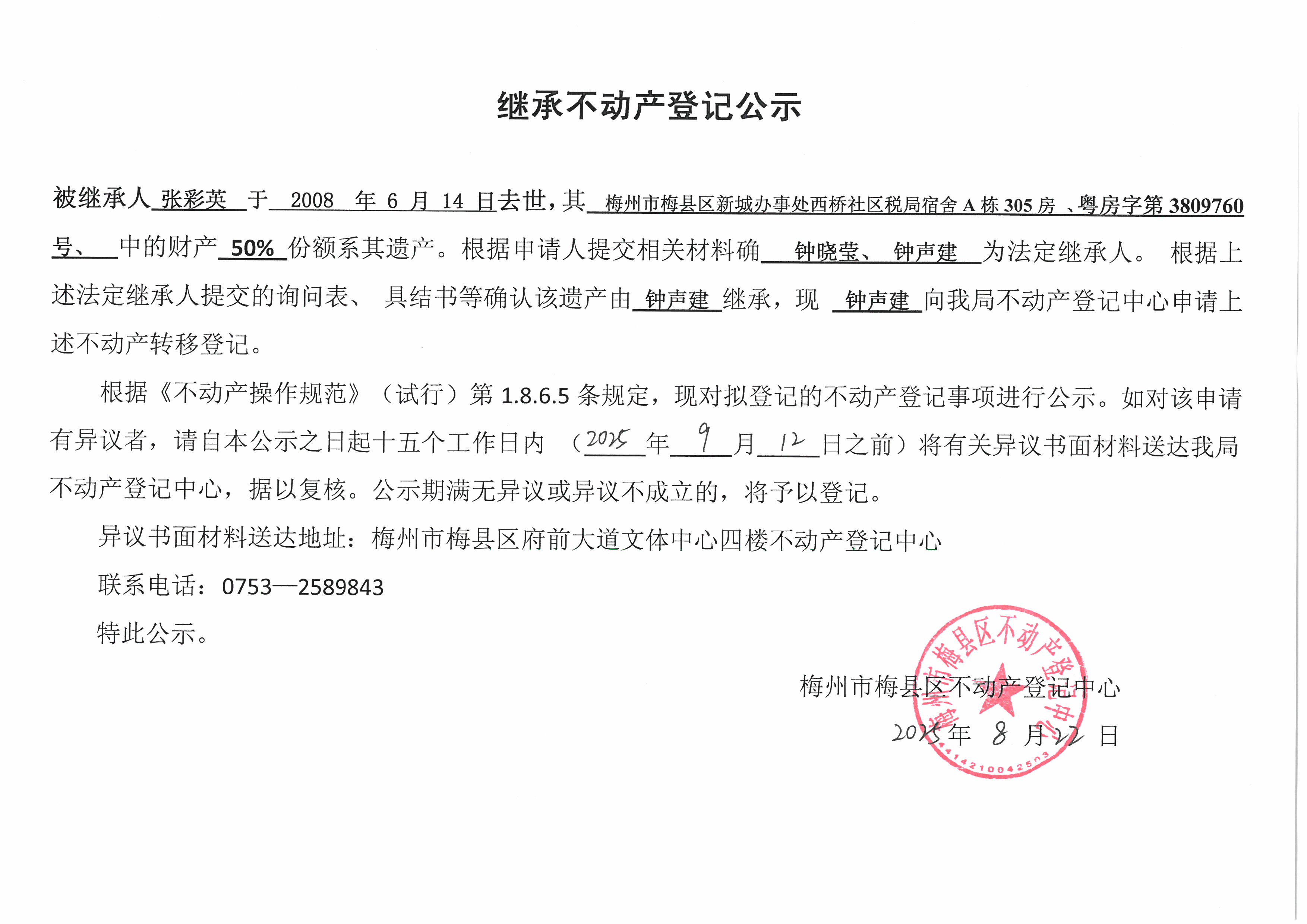 被继承人张彩英于2008年6月14日去世,其梅州市梅县区新城办事处西桥社区税局宿舍A栋305房 、粤房字第3809760号、中的财产50%份额系其遗产。根据申请人提交相关材料确钟晓莹、钟声建为法定继承人。根据上述法定继承人提交的询问表、具结书等确认该遗产由钟声建继承,现钟声建向我局不动产登记中心申请上述不动产转移登记。