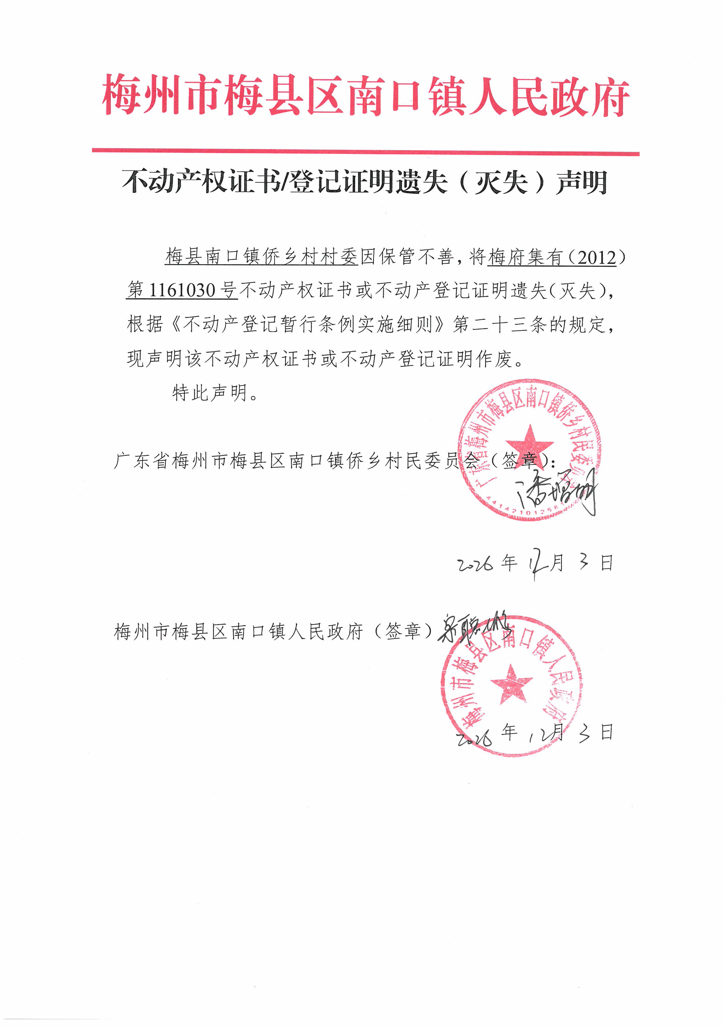 梅县南口镇侨乡村村委因保管不善,将梅府集有(2012)第1161030号不动产权证书或不动产登记证明遗失(灭失)根据《不动产登记暂行条例实施细则》第二十三条的规定,现声明该不动产权证书或不动产登记证明作废。