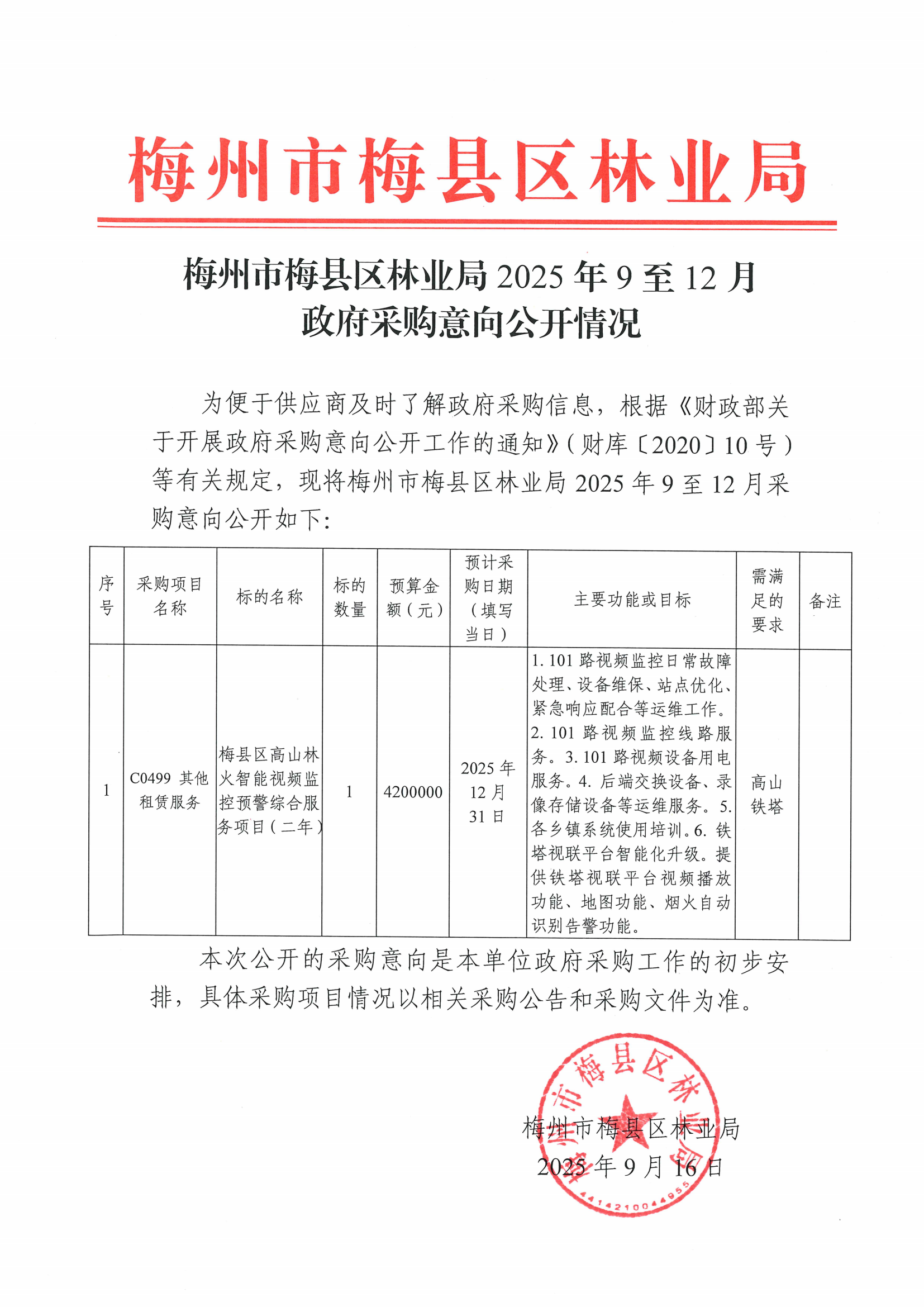 梅州市梅县区林业局2025年9至12月政府采购意向公开情况