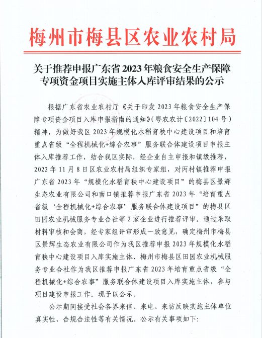 关于推荐申报广东省2023年粮食安全生产保障专项资金项目实施主体入库评审结果的公示