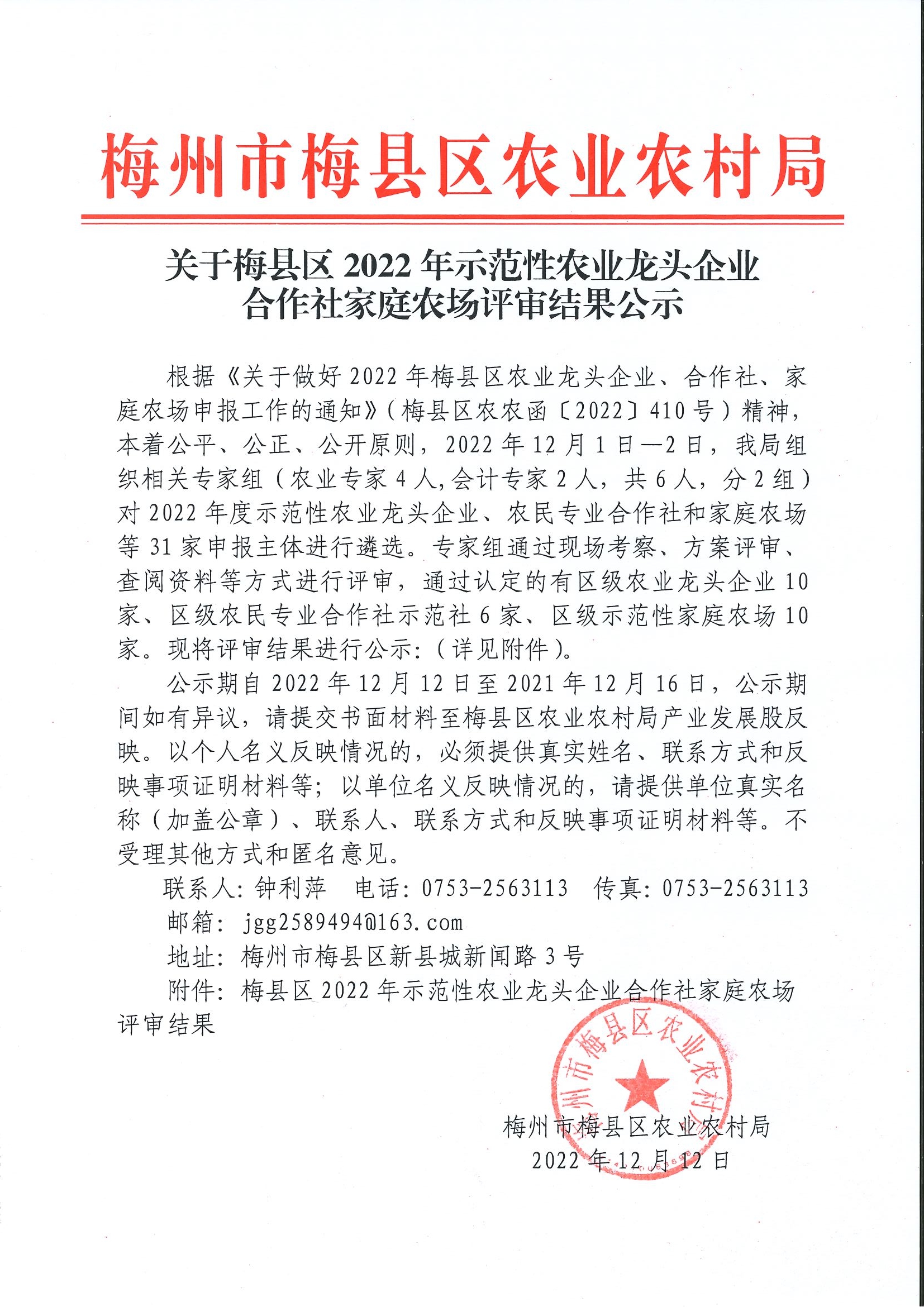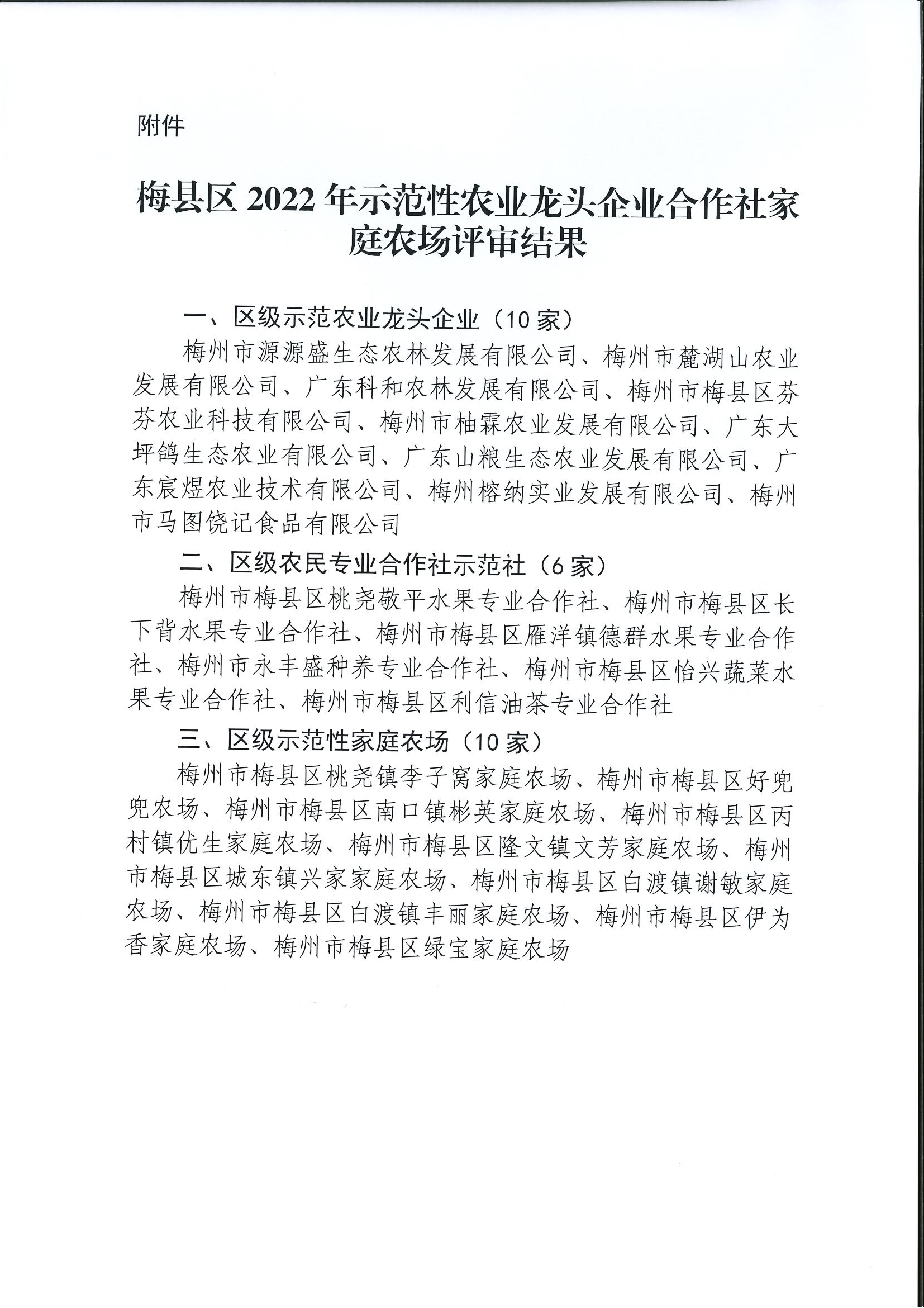 关于梅县区2022年示范性农业龙头企业合作社家庭农场评审结果公示