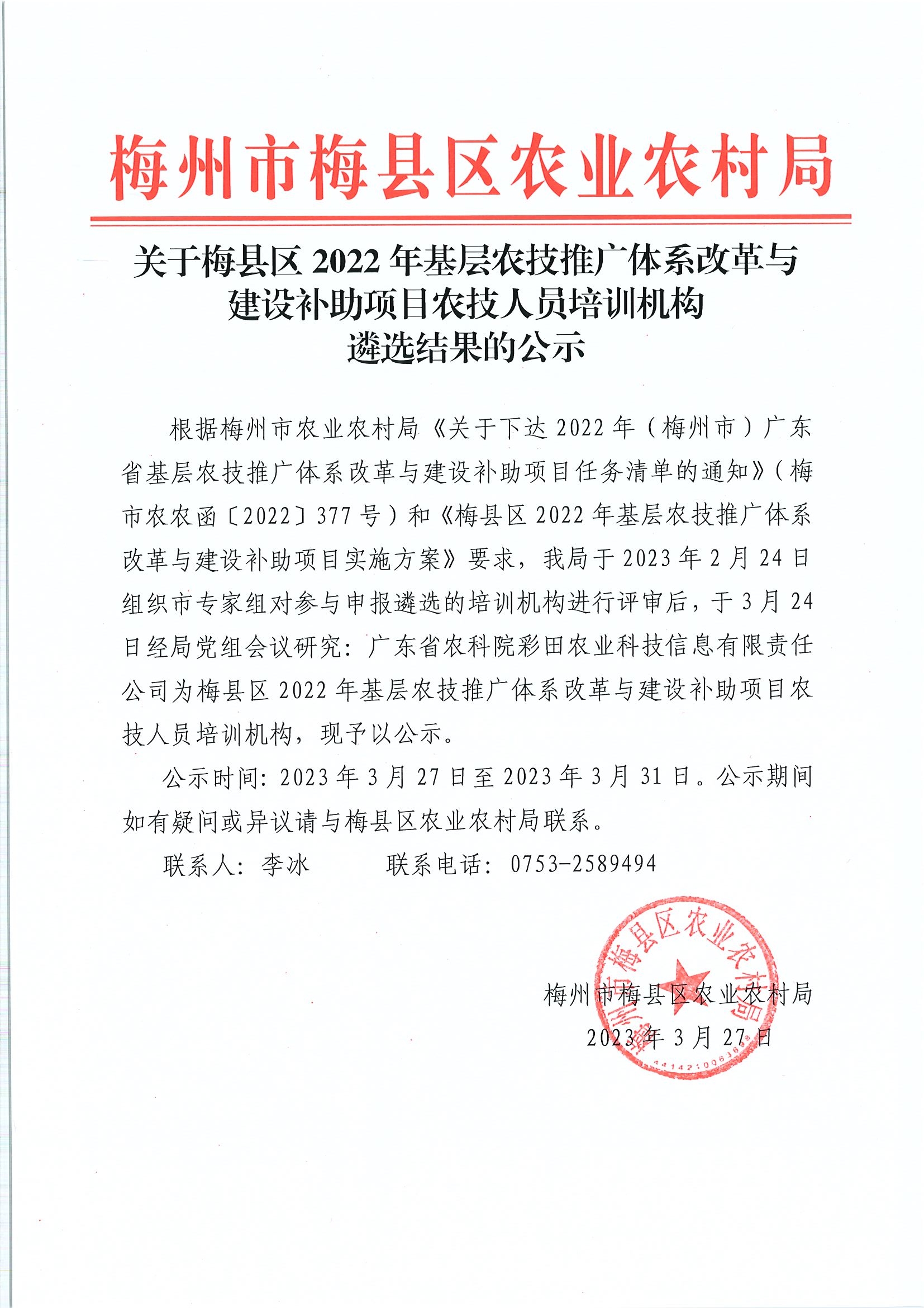 关于梅县区2022年基层农技推广体系改革与建设补助项目农技人员培训机构遴选结果的公示
