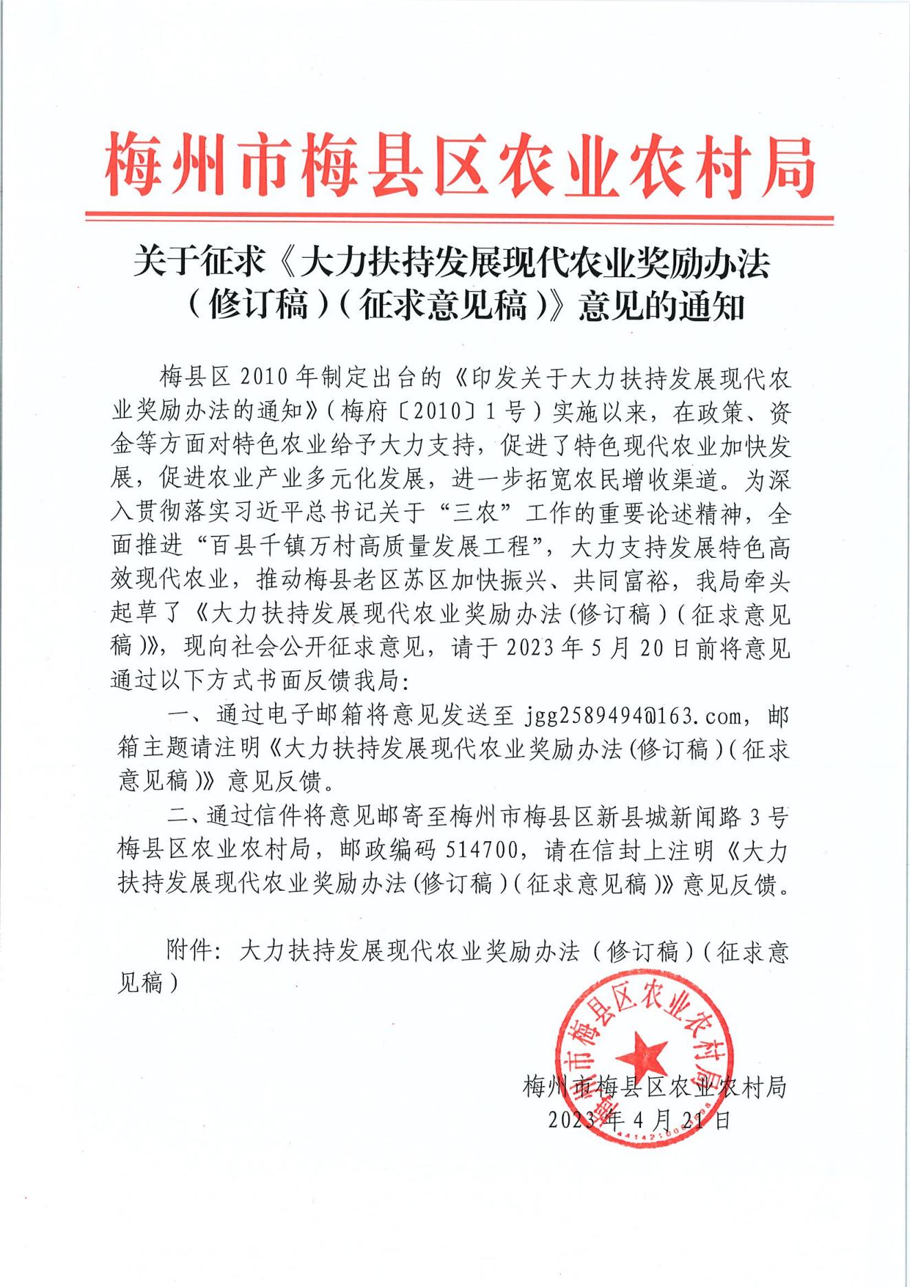 | 名称: | 关于征求《大力扶持发展现代农业奖励办法 (修订稿)(征求意见稿)》意见的通知 | ||