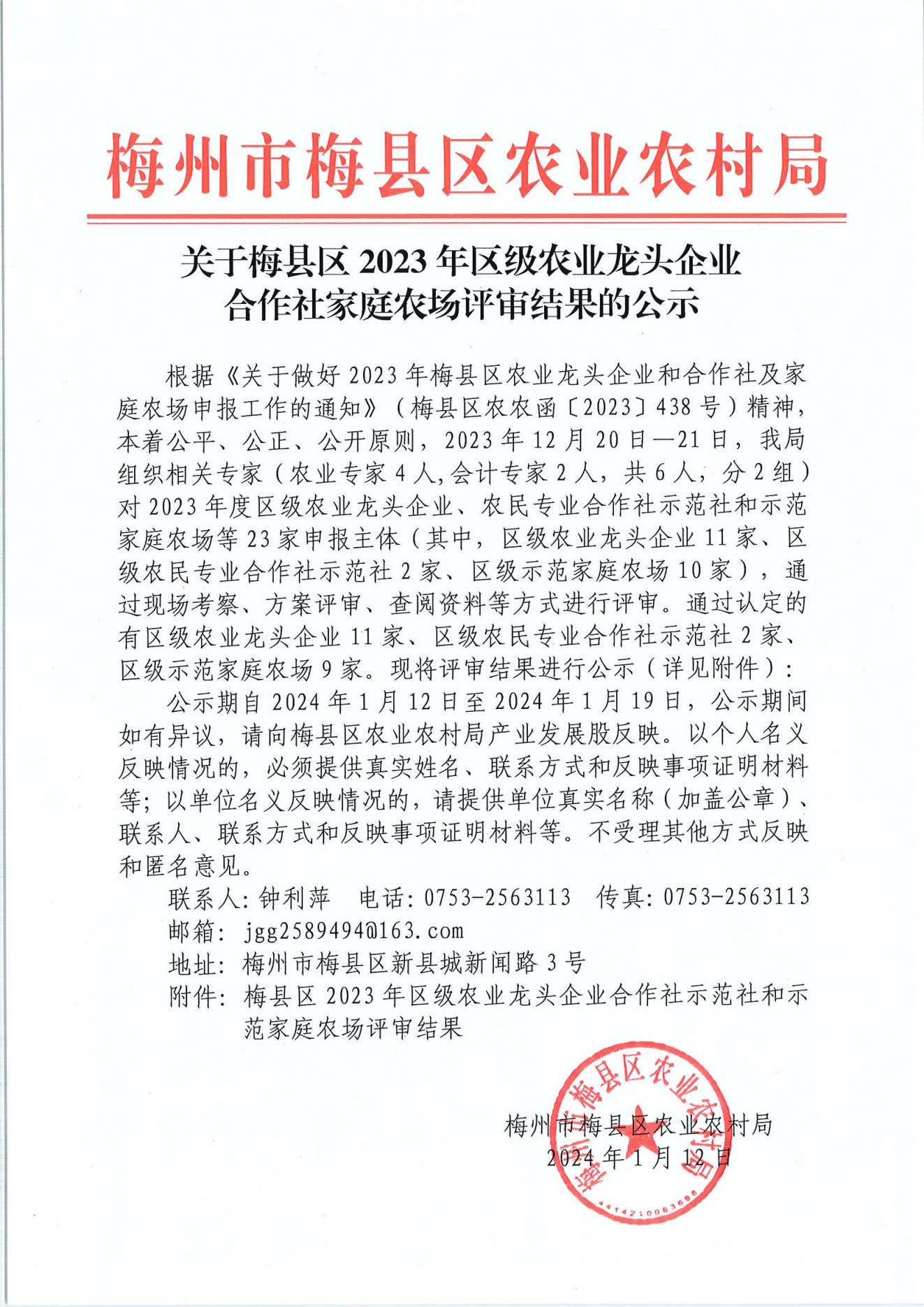 | 名称: | 关于梅县区2023年区级农业龙头企业合作社家庭农场评审结果的公示 | ||