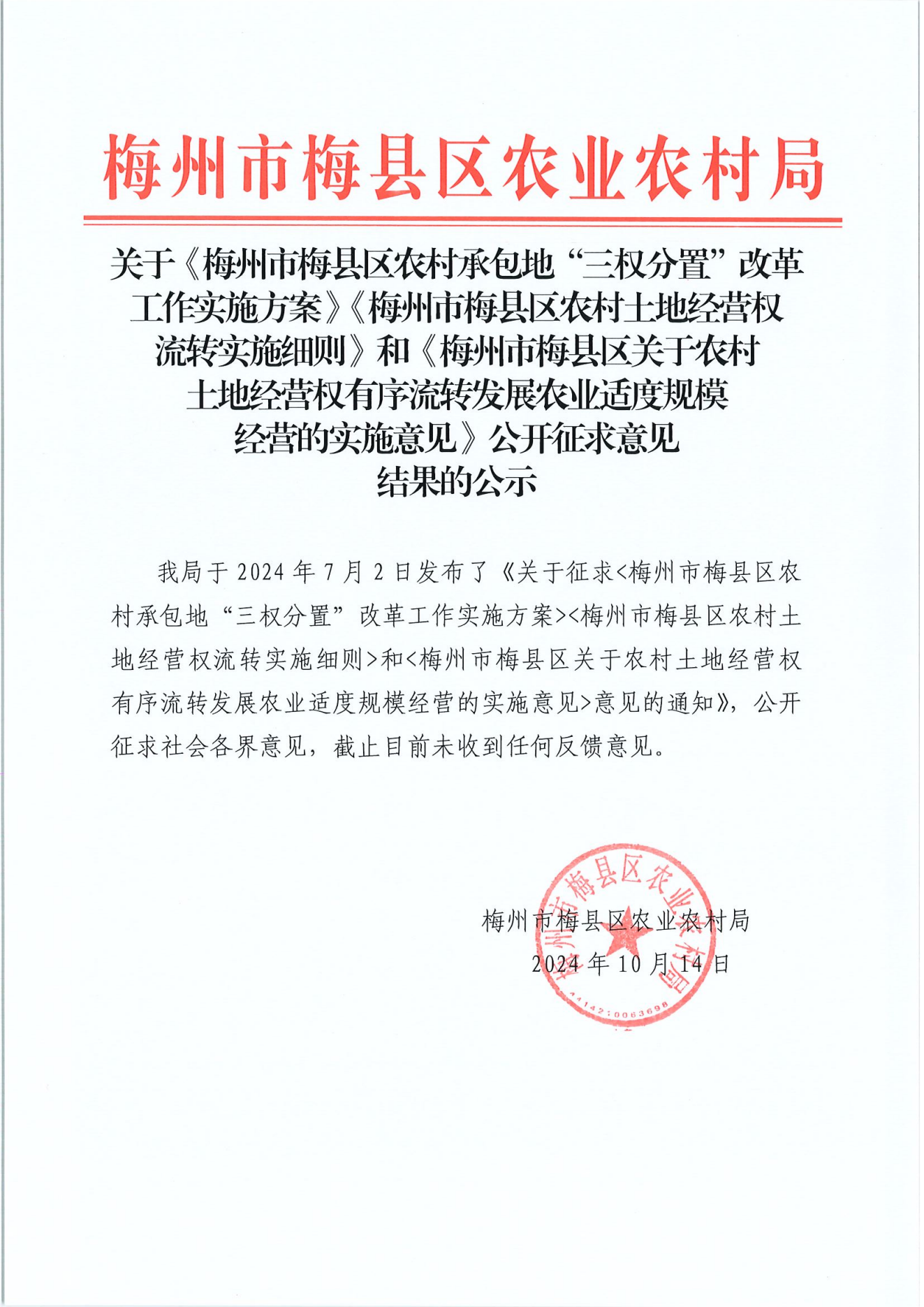 关于《梅州市梅县区农村承包地“三权分置”改革工作实施方案》《梅州市梅县区农村土地经营权流转实施细则》和《梅州市梅县区关于农村土地经营权有序流转发展农业适度规模经营的实施意见》公开征求意见结果的公示