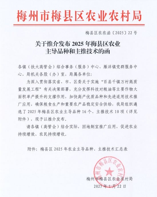 关于推介发布2025年梅县区农业主导品种和主推技术的函