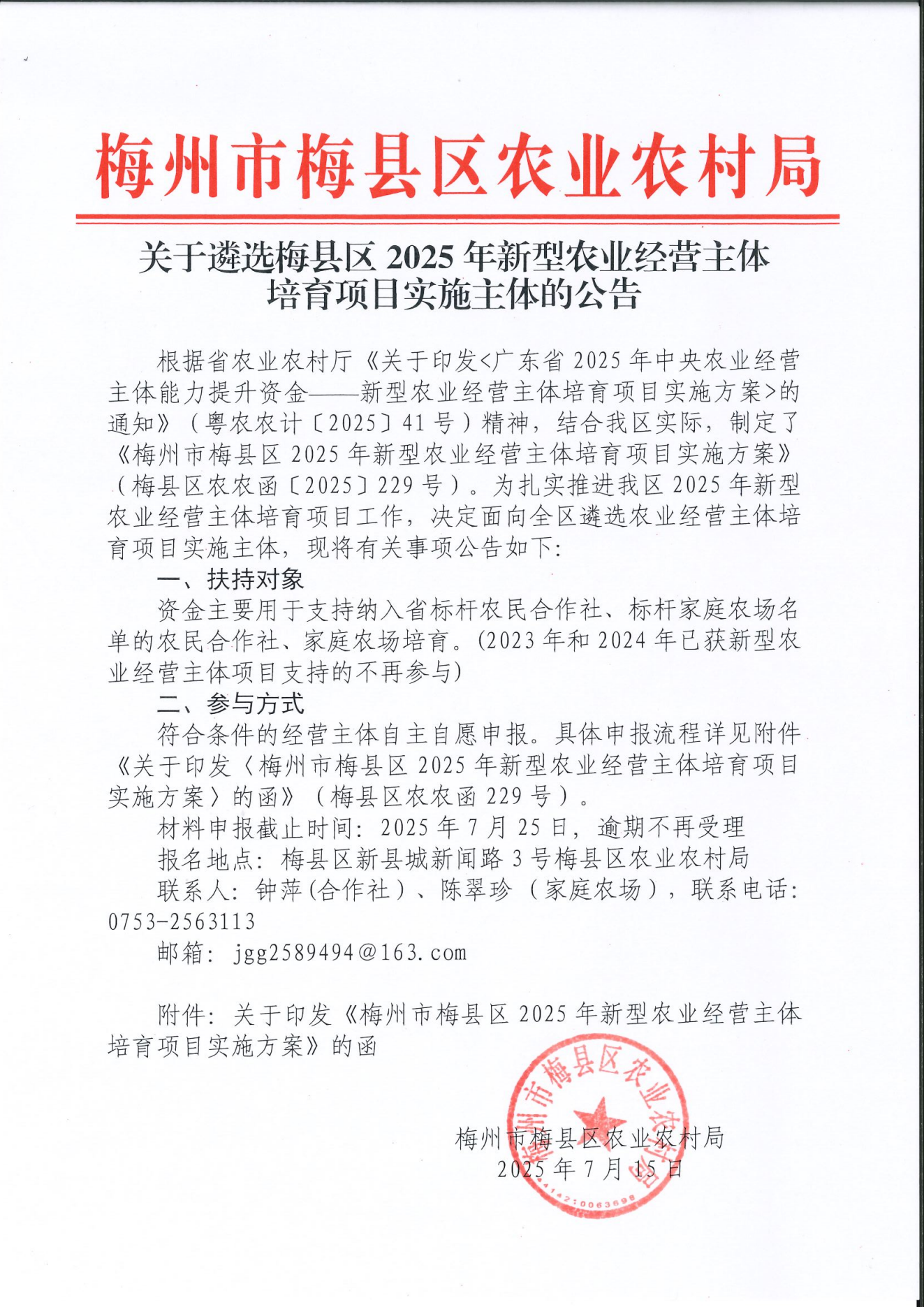 关于遴选梅县区2025年新型农业经营主体培育项目实施主体的公告