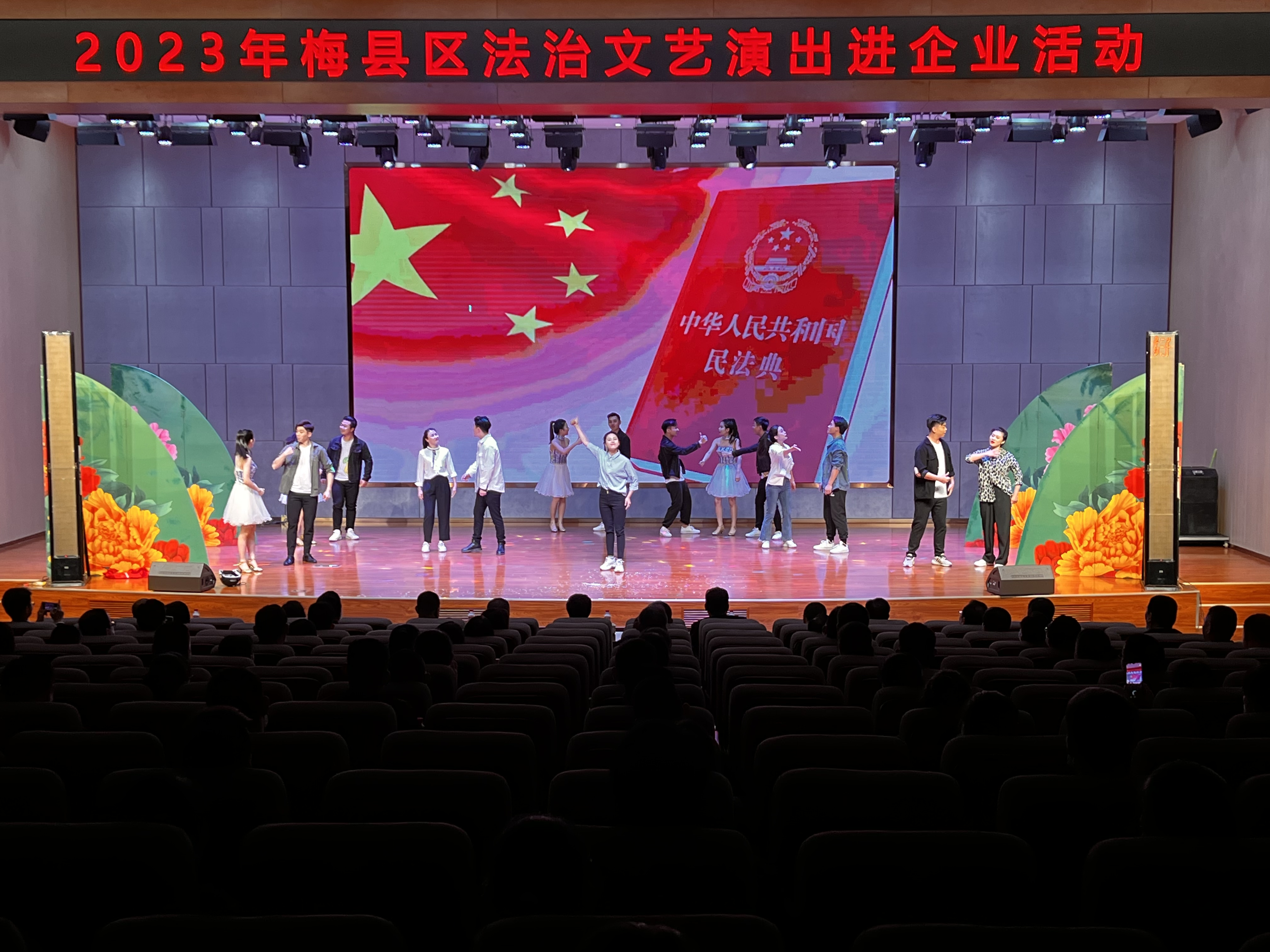 演出在舞蹈《盛世花开》中拉开序幕,紧接着山歌对唱《叶帅故里 法润梅县》、朗诵《法治的天空》、小品《法网难逃》等精彩节目轮番上演,现场还通过几轮简单的法律知识有奖问答与观众互动,为企业职工送上民法典普法大礼包,让职工在寓教于乐中了解法律知识。演出结束后,现场还设立了法律咨询台,为职工现场解答法律问题。