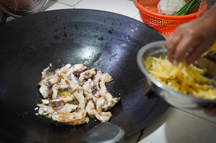 鱼焖饭中的鱼,便是整道菜肴的灵魂所在。客家人通常选用野生草鱼作为主料,因为这种鱼肉质细嫩,味道鲜美,且富含优质蛋白质和不饱和脂肪酸。为了保证鱼的新鲜度,阿叔提前在院子的鱼塘打捞好鱼,确保鱼在捕捞后能够迅速被用于烹饪,其中的鱼血是鱼焖饭中不可或缺的原料之一。