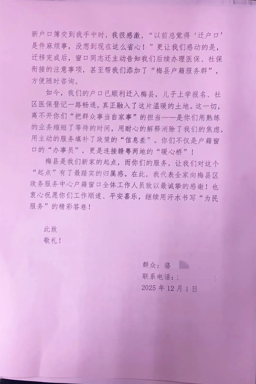 近日,梅县公安政务服务中心收到群众骆女士的感谢信,感谢程江派出所户籍窗口工作人员帮助其与儿子快速办理跨省户籍迁移业务,保障了孩子的高考报名,对窗口工作人员专业、高效、贴心的服务表达深深谢意。