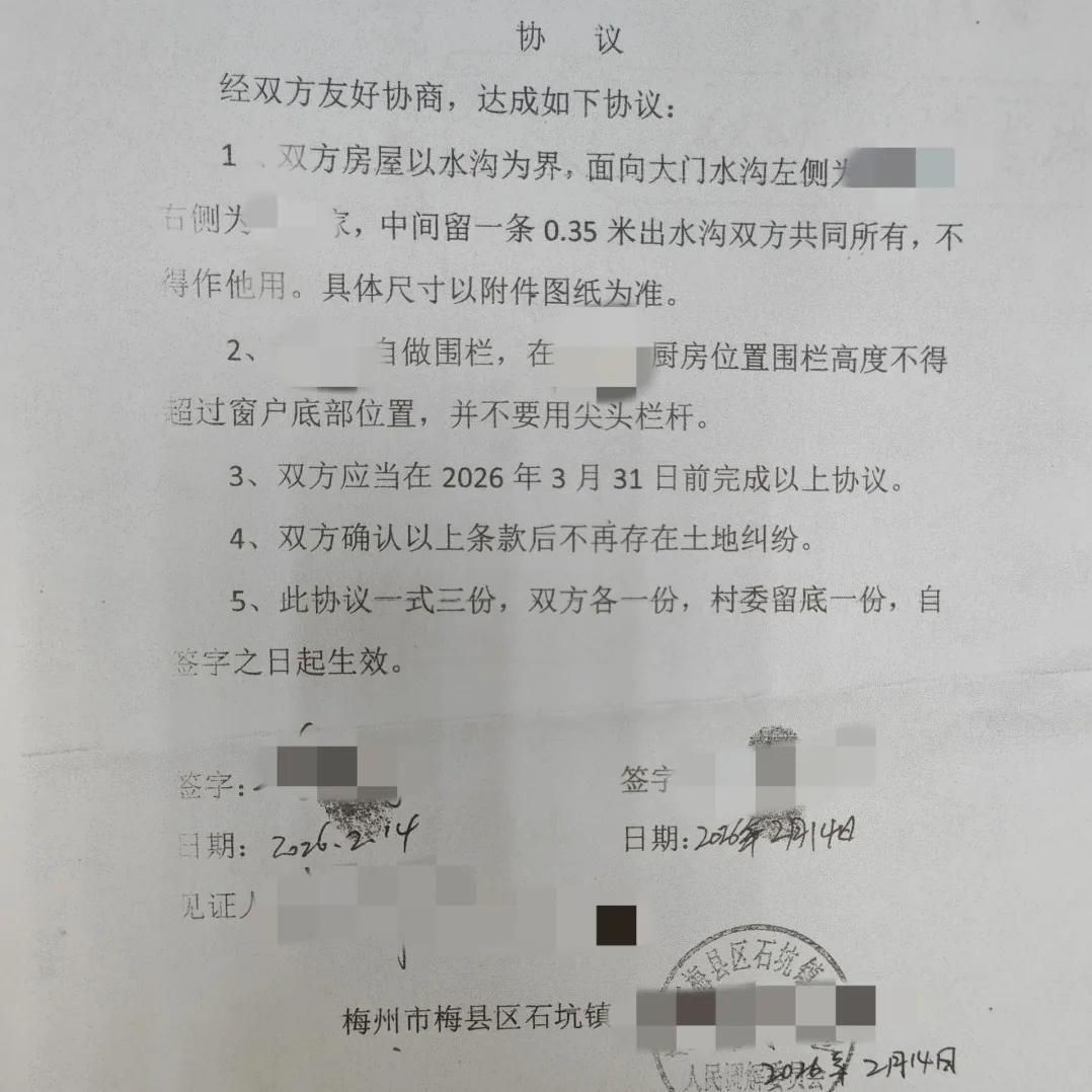今年春节,两家人及子女均返乡过年,人员齐整为矛盾化解提供了难得的契机。石坑派出所接到报警后,所领导带领值班民警迅速赶赴现场,联动村干部,启动“警村联调”机制。调解过程中,民警采取“背靠背”疏导情绪、“面对面”协商的方式,从法理、人情、乡俗多维度切入,引导双方换位思考,追溯多年邻里情谊。 从午后到深夜,经过近10个小时的连续攻坚,至23时许,双方终于放下成见,在村委会达成调解协议并签字。 一桩困扰两家人多年的“心头疙瘩”,在除夕前夕被成功解开。 此次调解是梅县公安践行新时代“枫桥经验”的生动注脚。通过抓住春节返乡“黄金窗口”,联动基层力量靠前发力,石坑派出所真正实现了“矛盾不上交、平安不出事”,用民警的坚守换来了辖区的和谐。 警方提醒: 邻里纠纷无小事,依法理性是正途。遇有土地、宅基地等争议,应通过村(居)委、司法所或公安机关等合法渠道解决,切莫因一时冲动激化矛盾,共同守护平安祥和的社会治安环境。