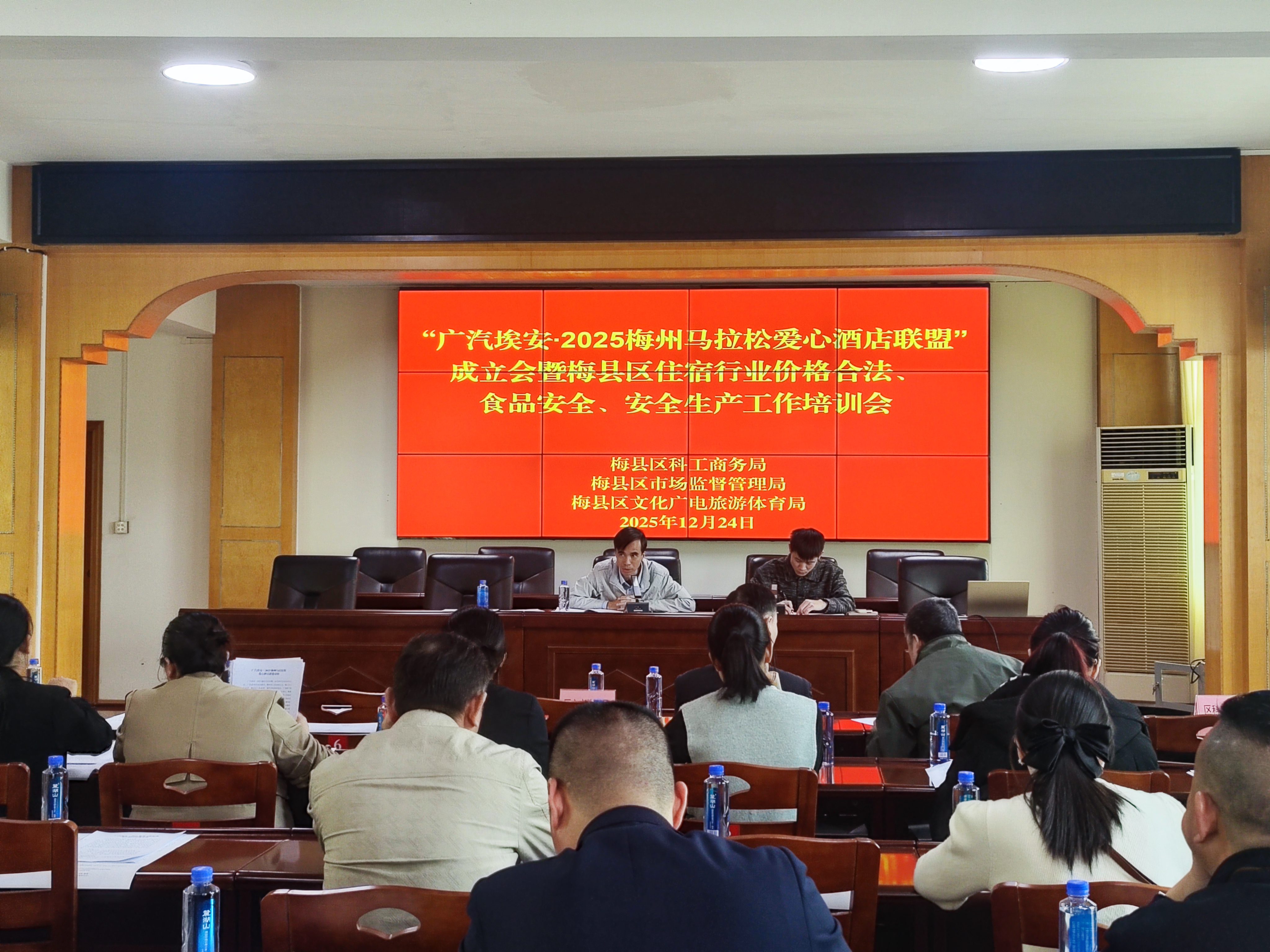 “广汽埃安·2025梅州马拉松爱心酒店联盟”成立会暨梅县区住宿行业价格合法、食品安全、安全生产工作培训会于12月24日在我局召开。本次培训会进一步推动我区住宿行业的规范发展,提升赛事服务品质,确保参赛选手的舒适体验。