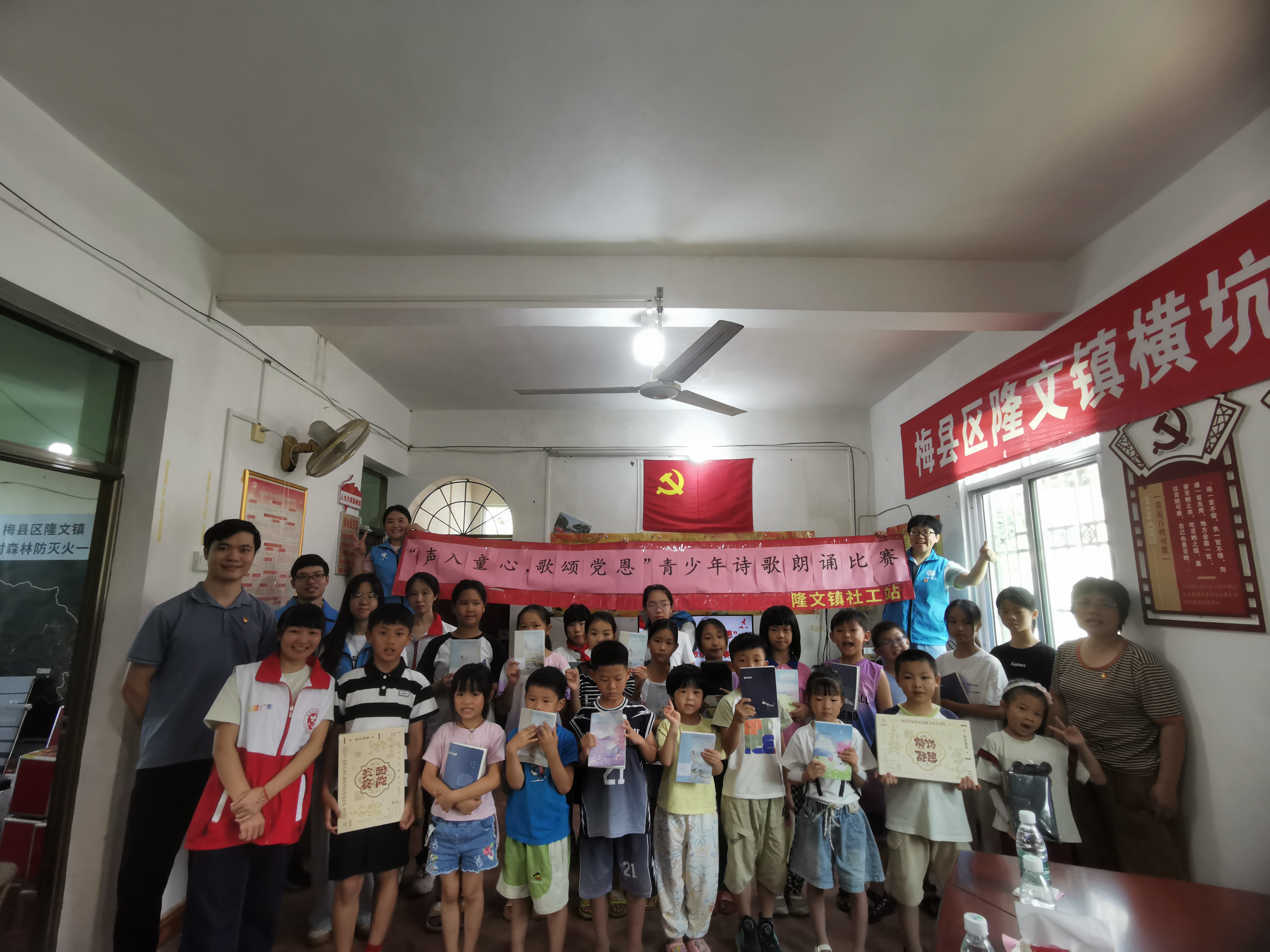 2025年是中国共产党建党104周年,也是中国人民抗日战争暨世界反法西斯战争胜利80周年。为引导青少年重温党的光辉历程,传承红色基因,厚植爱党爱国情怀,隆文镇社工站联合隆文镇横坑村新时代文明实践站,开展以“声入童心,歌颂党恩”为主题的青少年诗歌朗诵比赛活动。