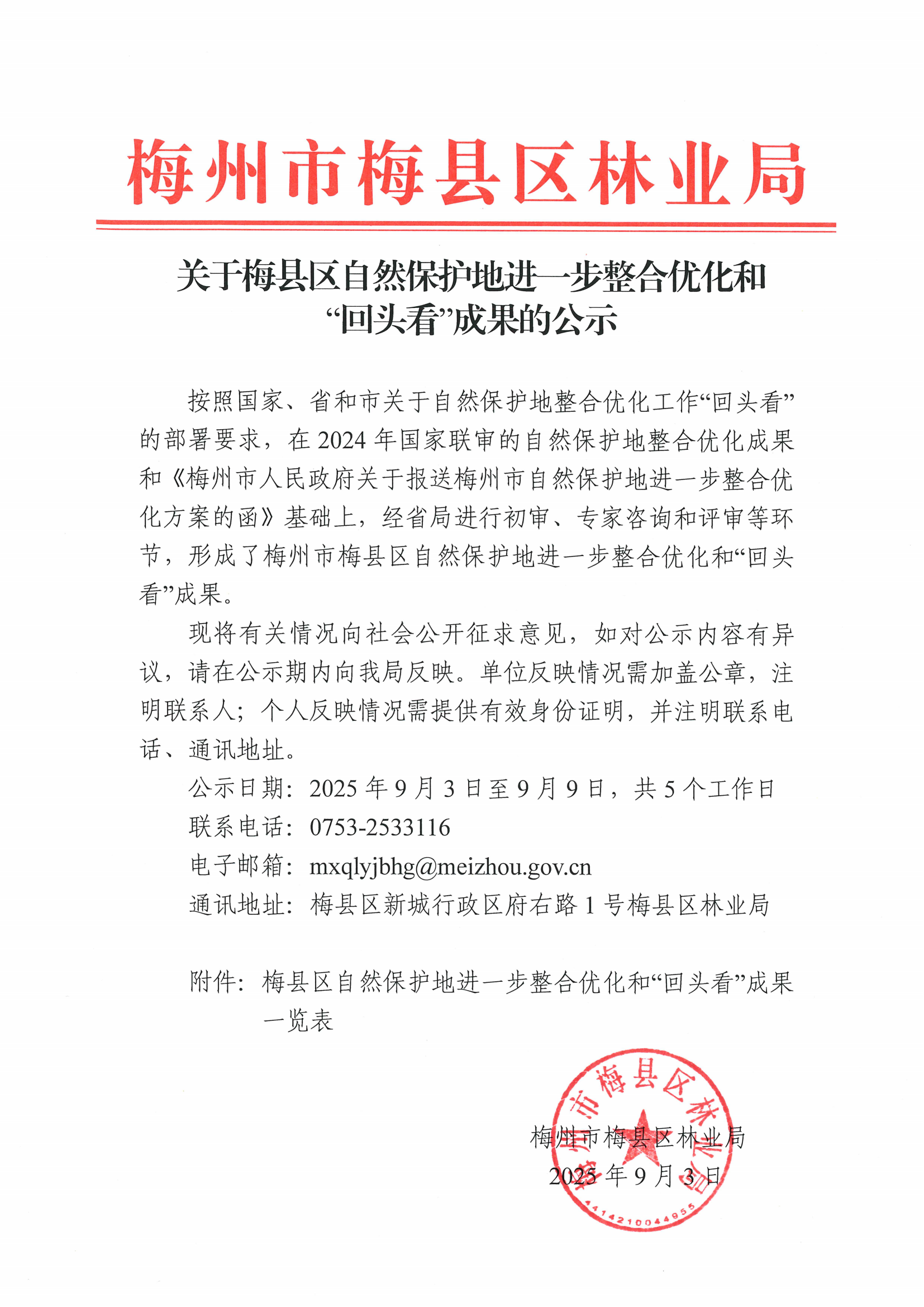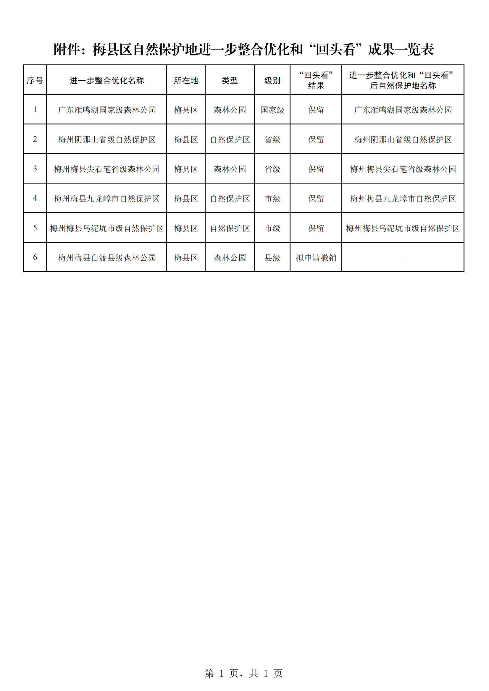 关于梅县区自然保护地进一步整合优化和“回头看”成果的公示