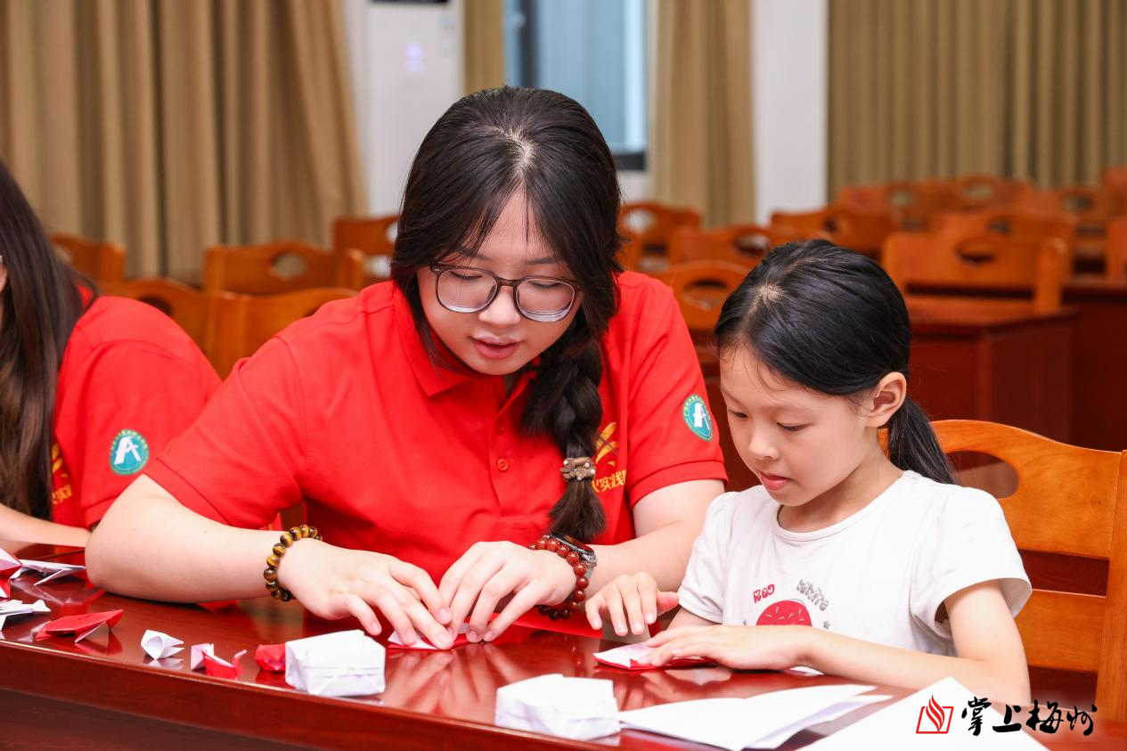 水美村村委会会议室化身“关爱儿童成长暑期夏令营”课室,孩子们在此沉浸式体验非遗文化的魅力,感受丰富多彩的艺术思政课程。缤纷的漆扇彩染在孩子稚嫩手中晕开,一把把“童年漆扇”跃然而出;灵巧的剪刀在红纸间穿梭,剪出了饱含客家风情的窗花;彩色的小纸在指尖翻飞,深入领略中国传统折纸艺术的文化精髓。非遗不再是书本概念,而是化作指尖流淌的温度。“老师,这扇子上的蓝色像不像石子岭的溪流?”孩子们兴奋地展示作品。