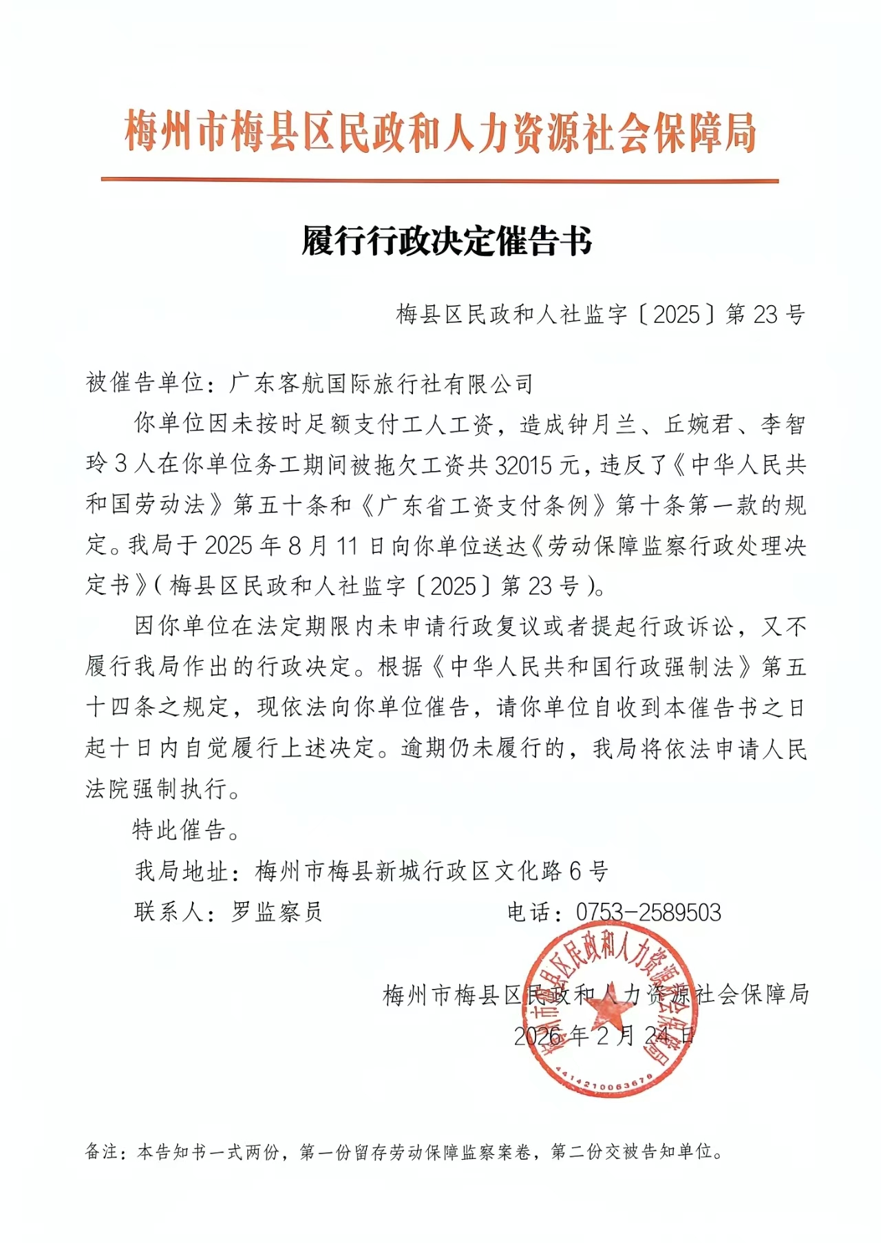 我局查处你单位拖欠钟某某、丘某某、李某某3人工资一案,因采取其他方式无法向你单位送达文书,依照《中华人民共和国民事诉讼法》第九十五条、《广东省劳动保障监察条例》第四十七条规定,现向你单位公告送达《履行行政决定催告书》(梅县区民政和人社监字〔2025〕第23号),自公告之日起经过30日,即视为送达。