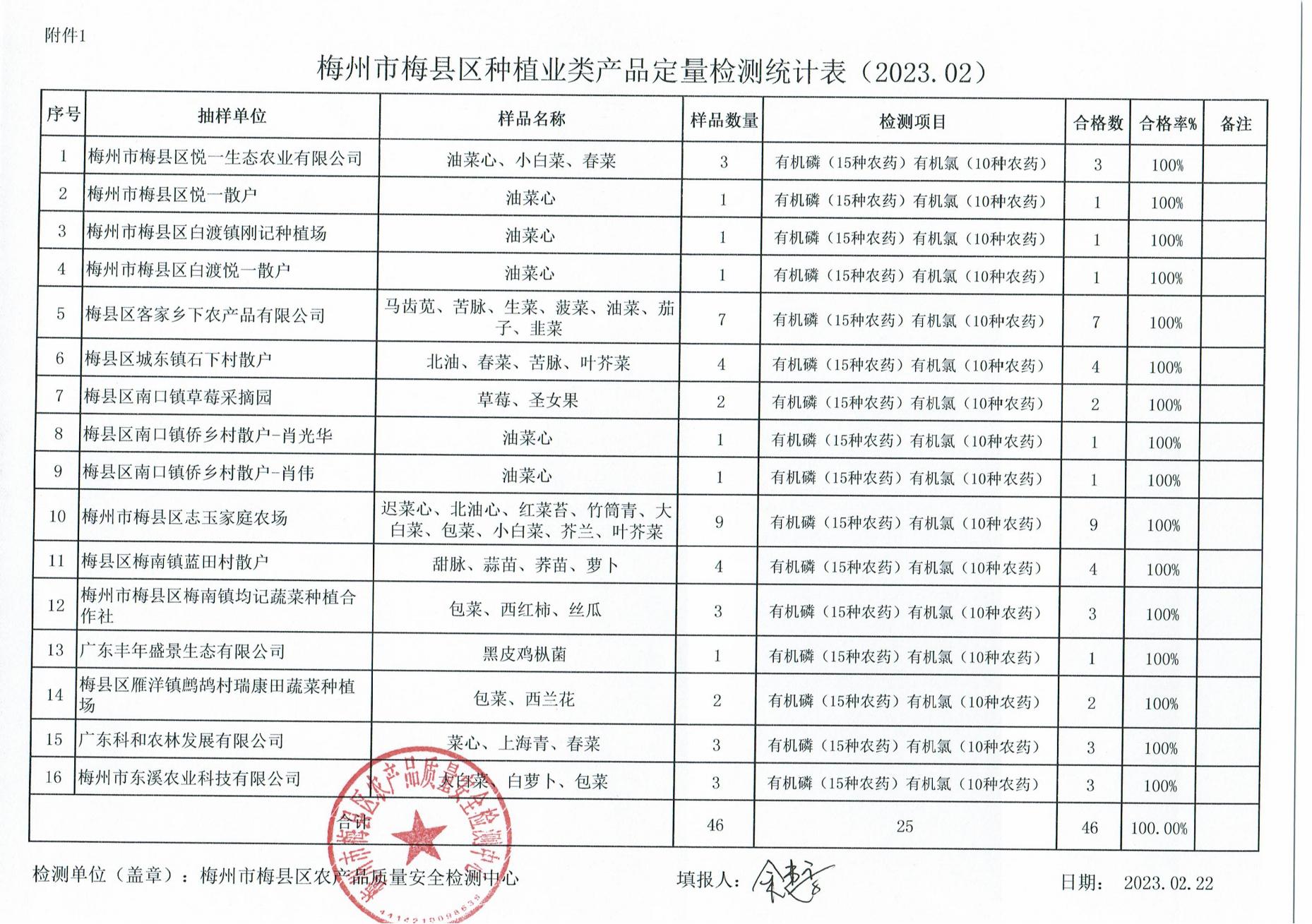 梅州市梅县区种植业类产品定量检测统计表(2023.2)