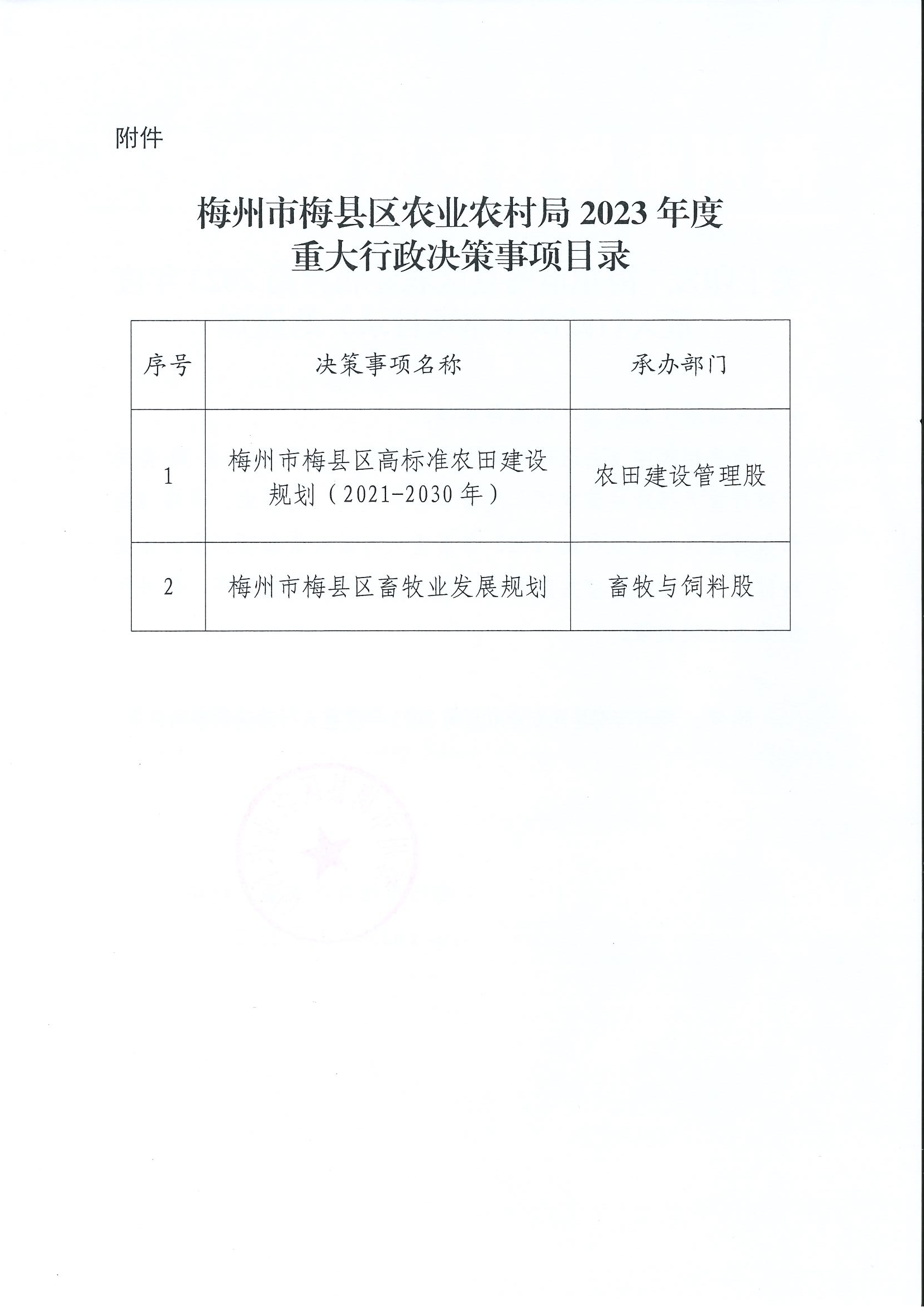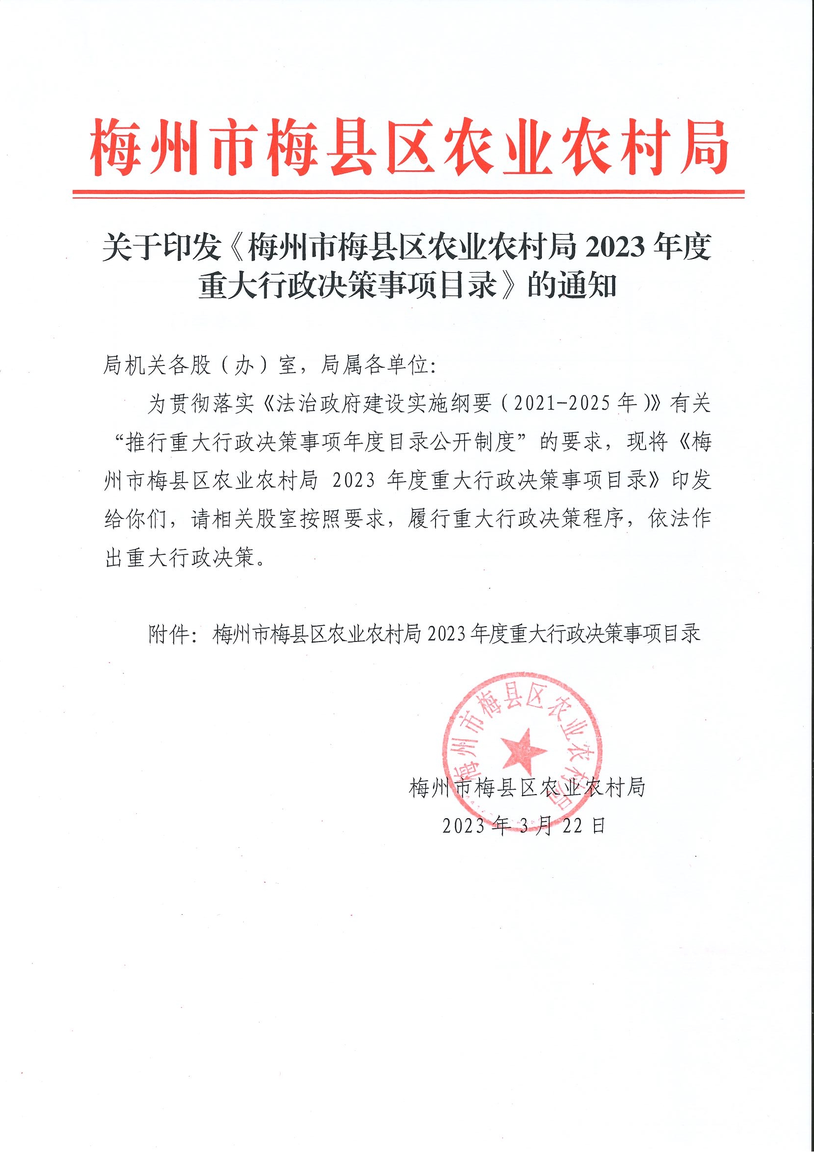 关于印发《梅州市梅县区农业农村局2023年度重大行政决策事项目录》的通知