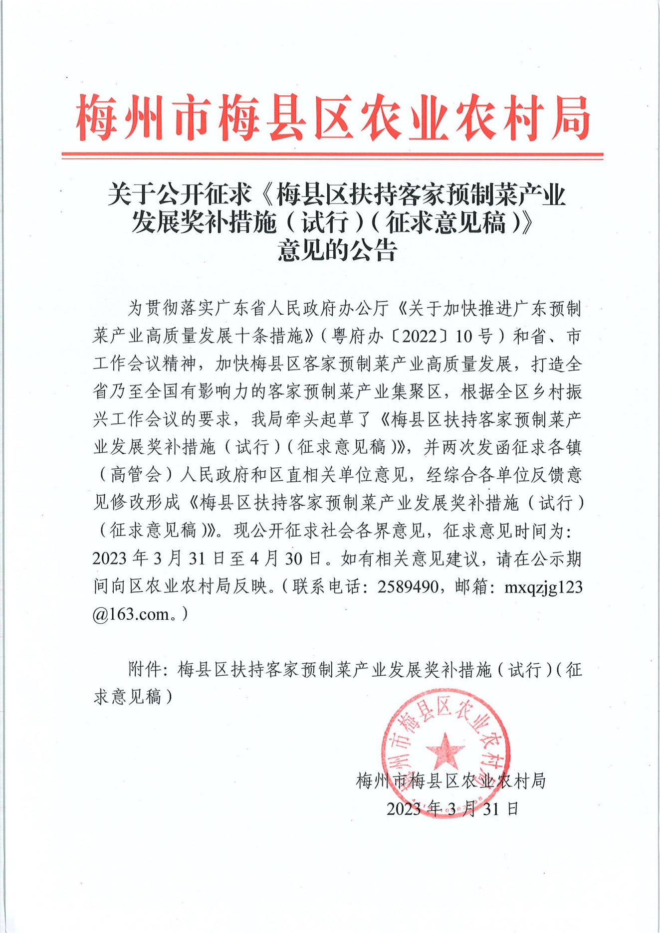 关于公开征求《梅县区扶持客家预制菜产业发展奖补措施(试行)(征求意见稿)》意见的公告