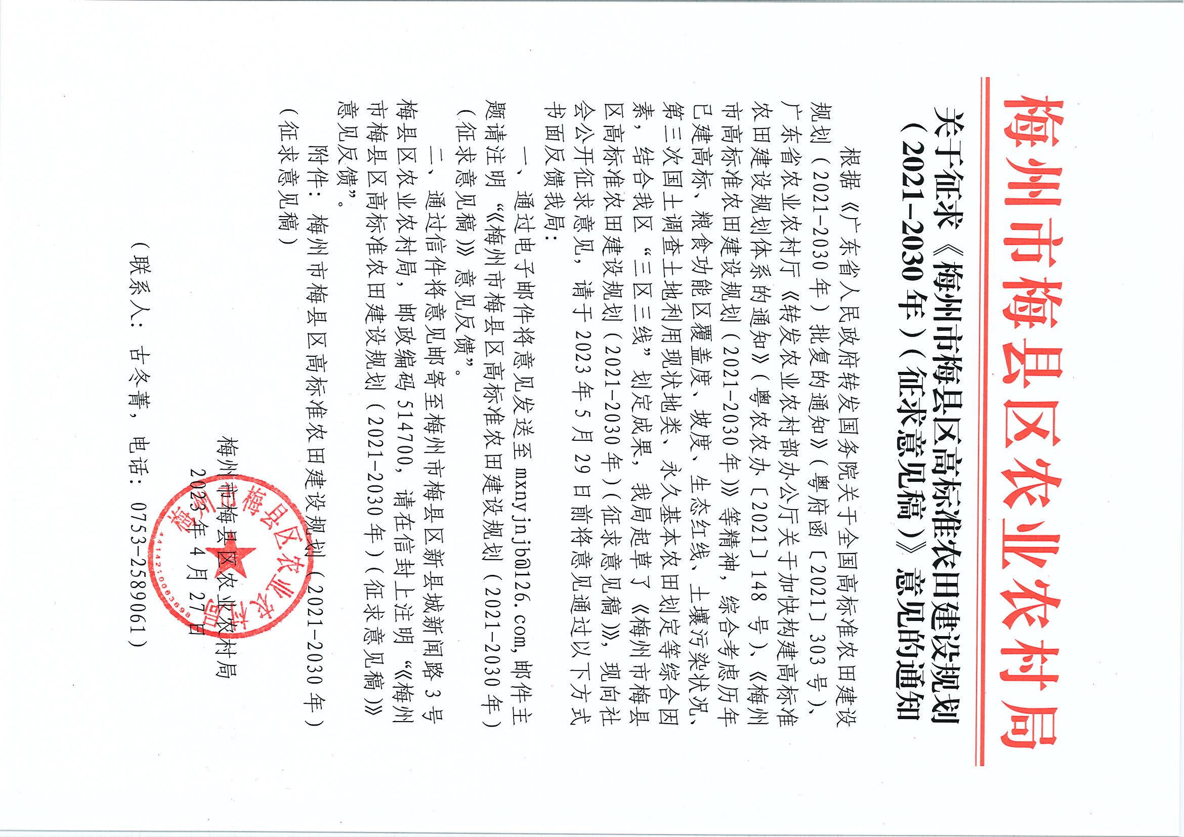 关于征求《梅州市梅县区高标准农田建设规划(2021-2030年)(征求意见稿)》意见的通知