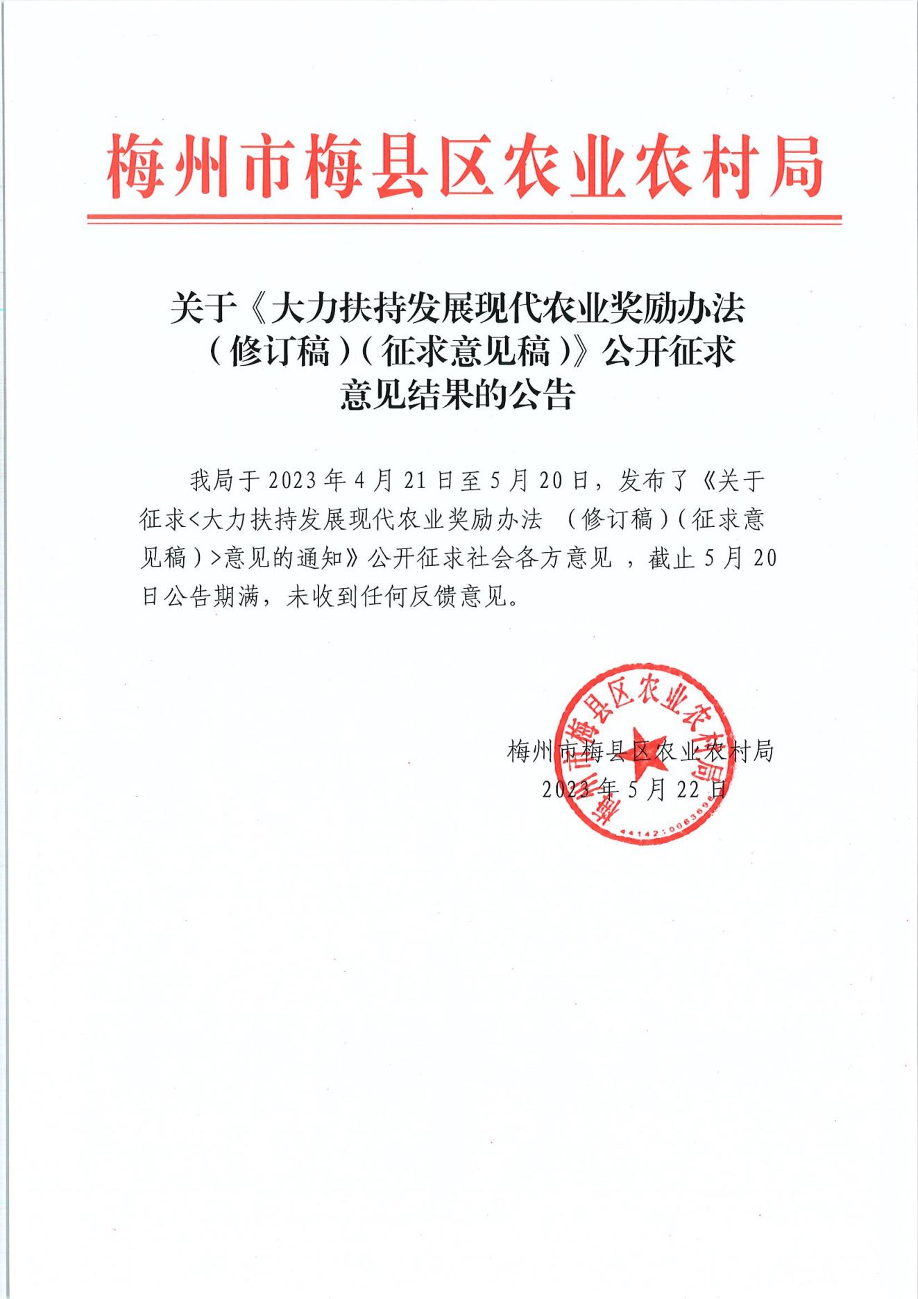 关于《大力扶持发展现代农业奖励办法(修订稿)(征求意见稿)》公开征求意见结果的公告