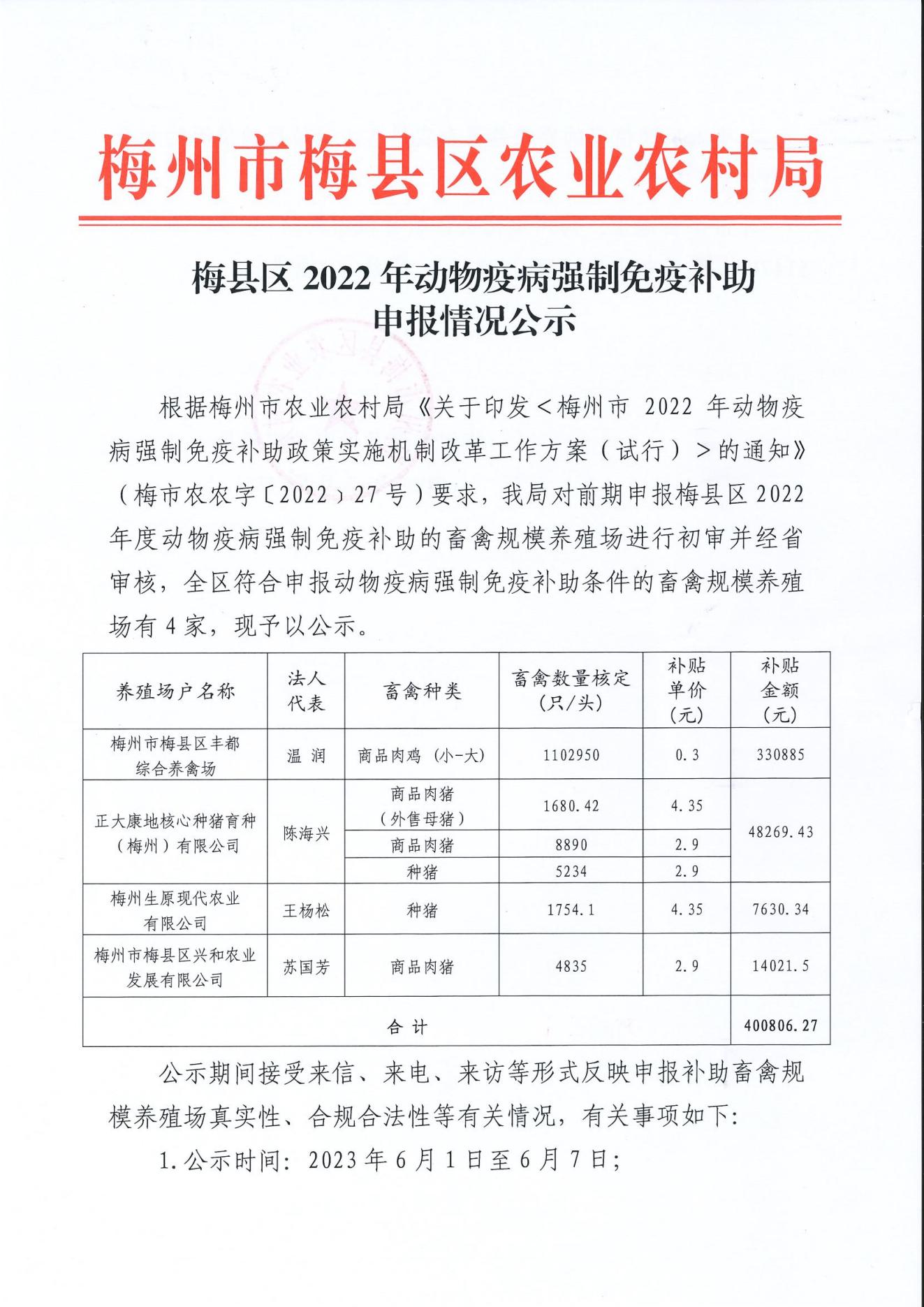 梅县区2022年动物疫病强制免疫补助申报情况公示