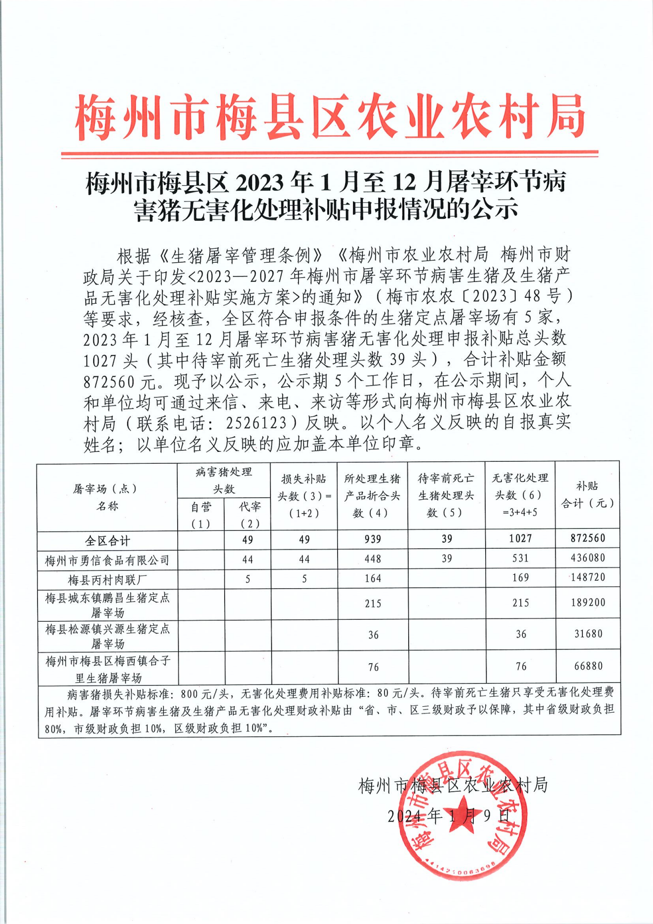 梅州市梅县区2023年1月至12月屠宰环节病害猪无害化处理补贴申报情况的公示