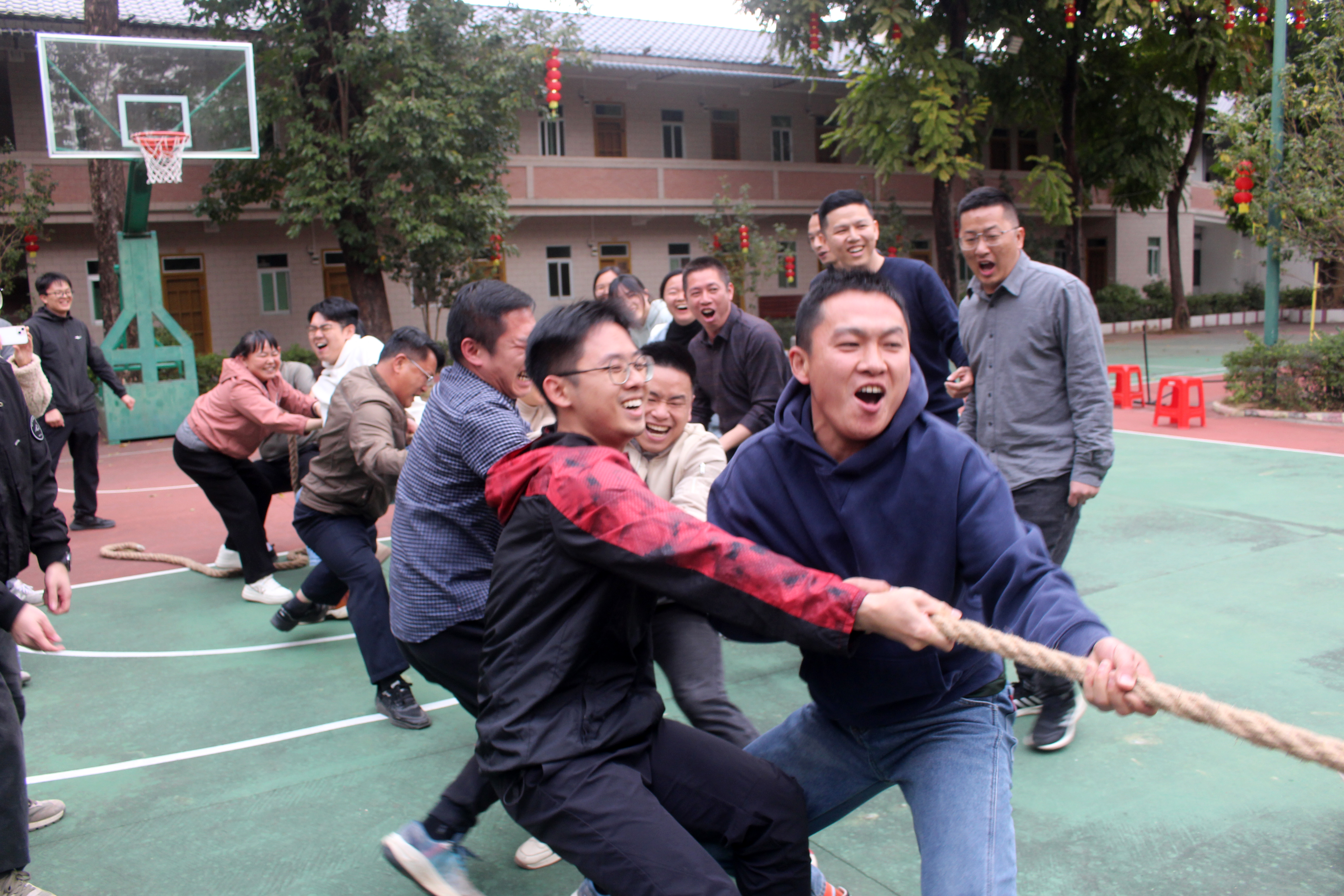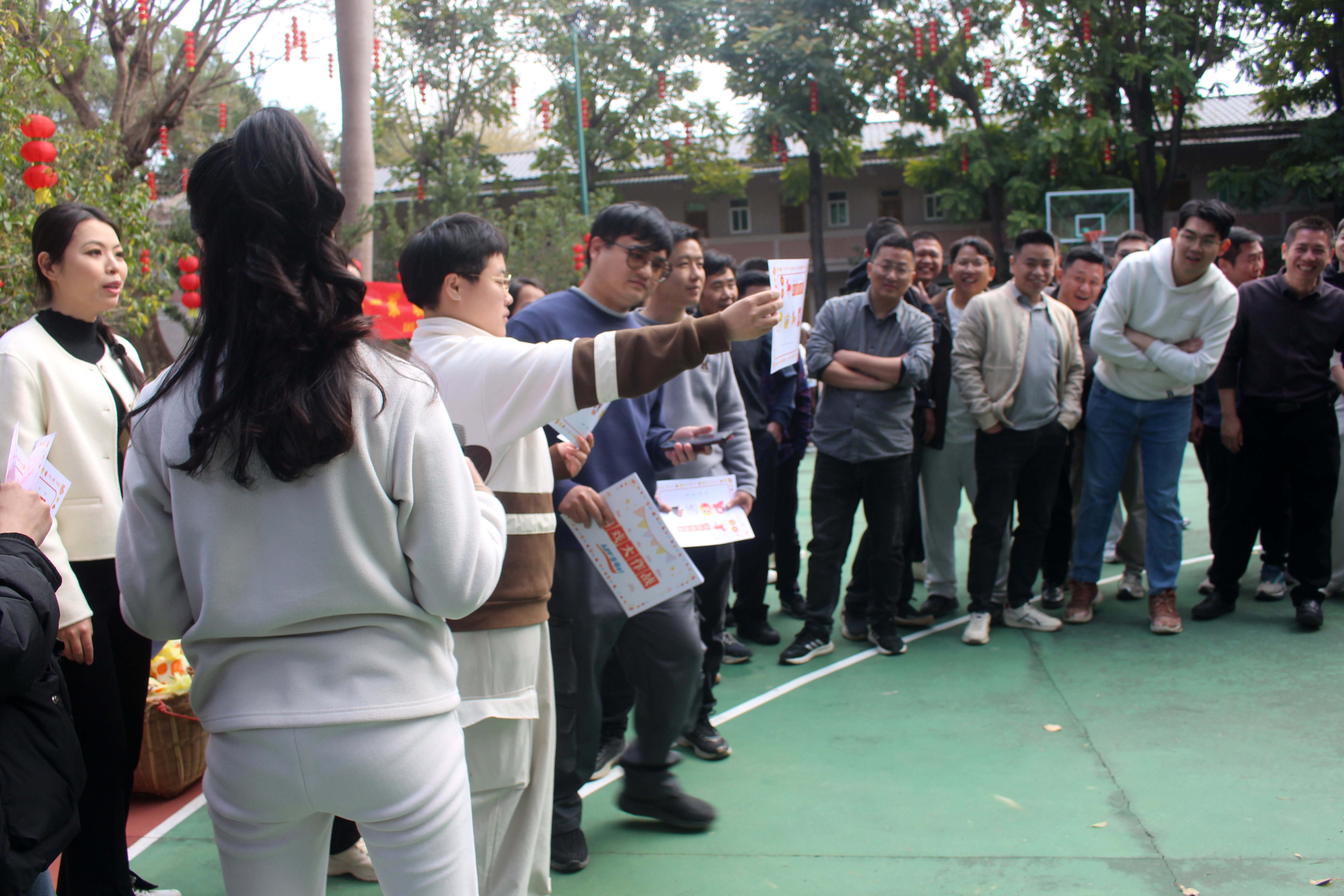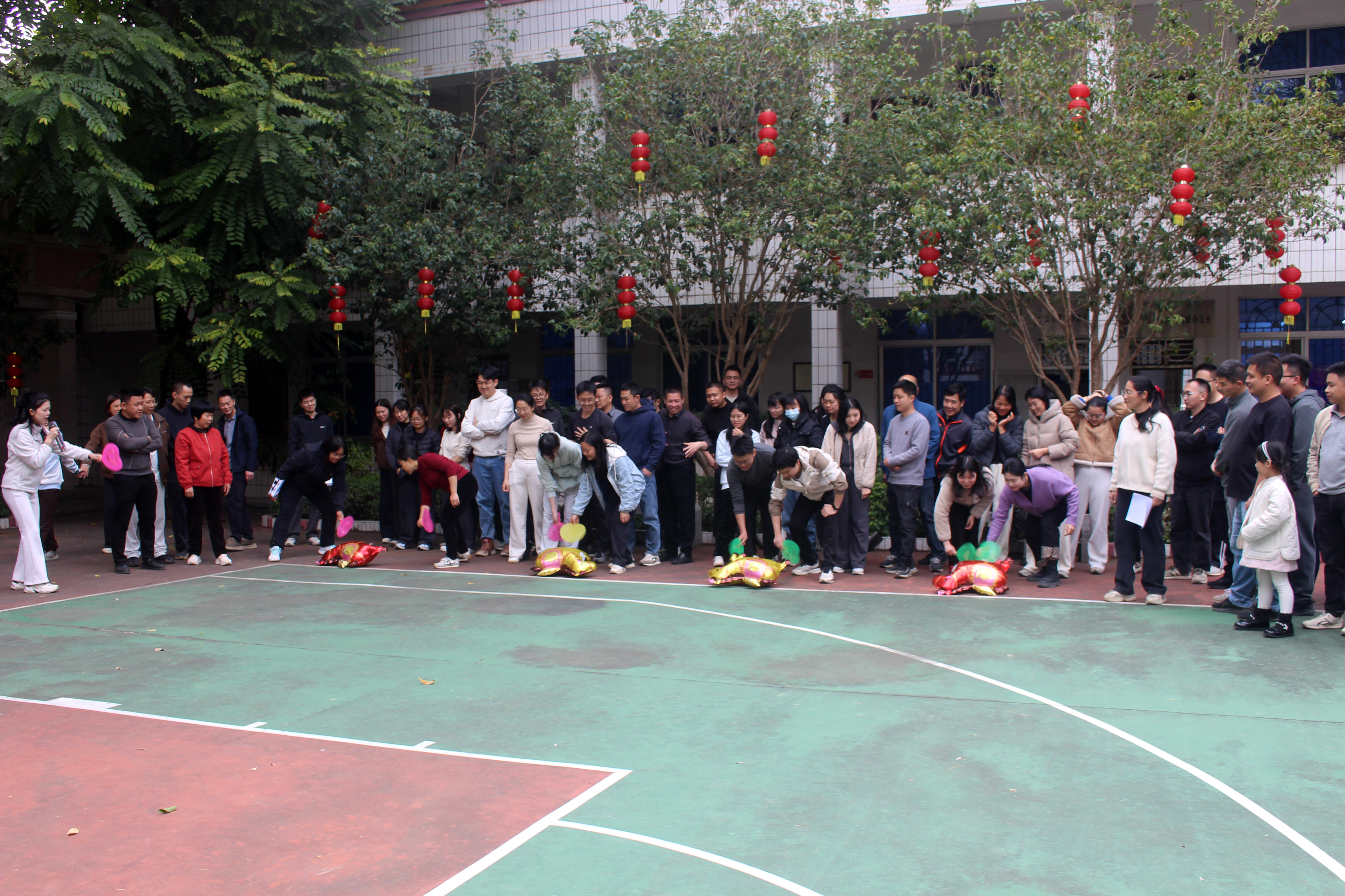 柚子接力赛考验默契与速度,每组10名队员接力传递、精准投掷,大家争分夺秒、配合流畅,在奔跑与传递中凝聚团队力量;成语猜猜乐以“马”为主题,看图猜词妙趣横生,限时两分钟内,各队成员脑洞大开、快速应答,尽显知识储备与反应能力;赶马入厩比赛趣味十足,队员两两搭档、手脚协作,以扇驱“马”奔向终点,默契配合与灵活技巧引得现场笑声不断;拔河比赛燃动全场,每组10名队员紧握长绳、脚蹬地面、齐心发力,三局两胜的赛制紧张激烈,呐喊声、助威声此起彼伏,充分展现团结拼搏的精神风貌。