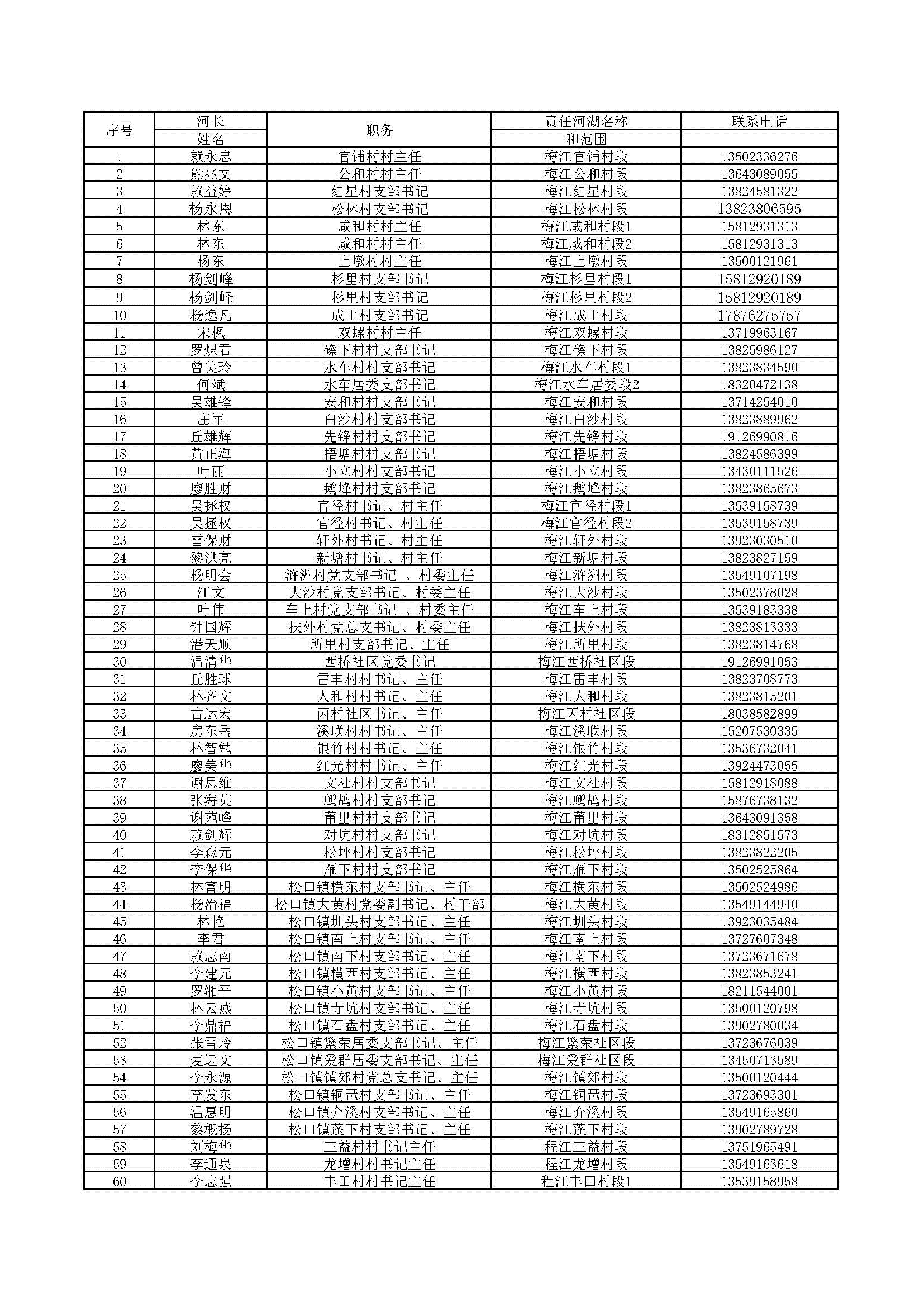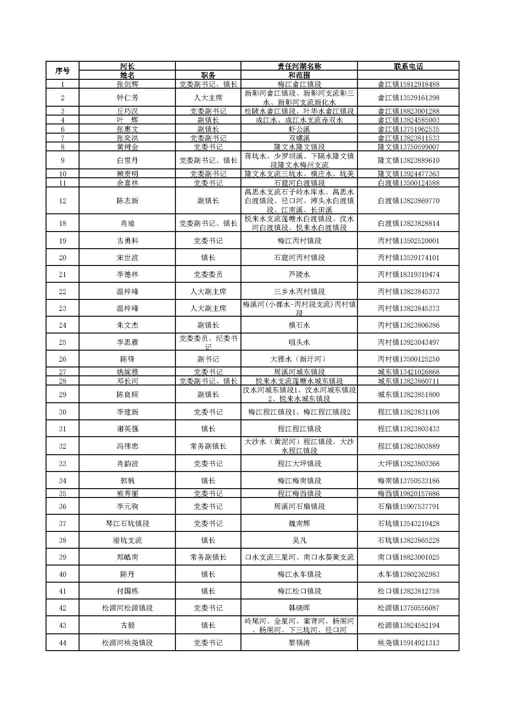 为深入贯彻落实党中央、国务院、省、市关于全面推行河湖长制的决策部署,加强我区河湖长制工作的组织领导,自觉接受社会监督,现将梅县区三级河长名单向社会公告。