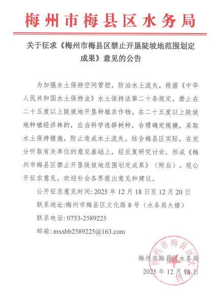 关于征求《梅州市梅县区禁止开垦陡坡地范围划定成果》意见的公告