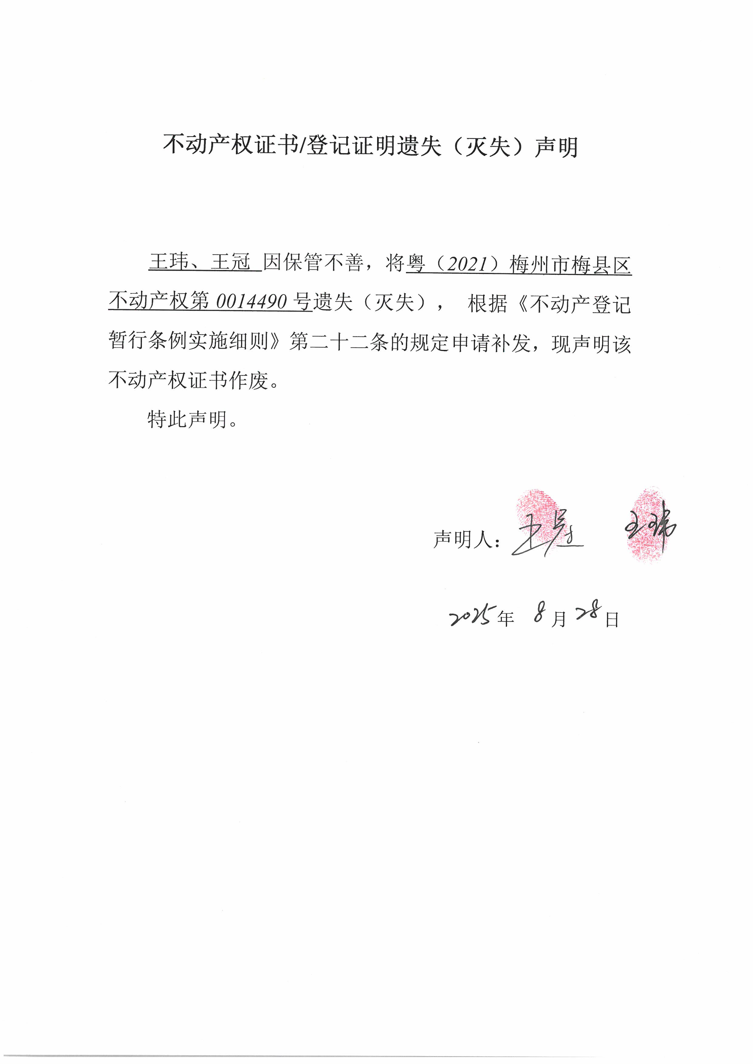 王玮、王冠因保管不善,将粤(2021)梅州市梅县区不动产权第0014490号遗失(灭失),根据《不动产登记暂行条例实施细则》第二十二条的规定申请补发,现声明该不动产权证书作废。
