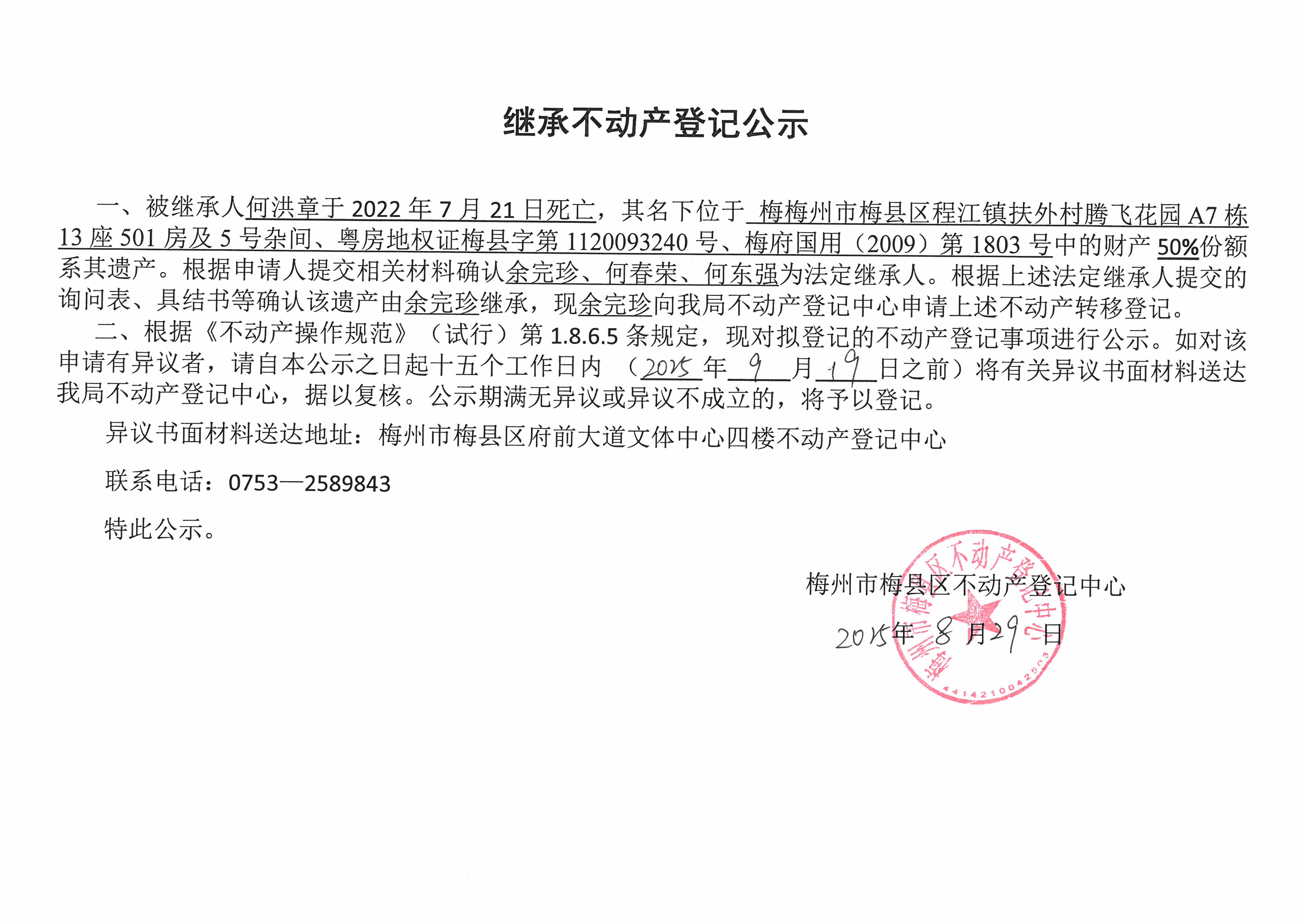 被继承人何洪章于2022年7月21日死亡,其名下位于梅州市梅县区程江镇扶外村腾飞花园A7栋13座501房及5号杂间、粤房地权证梅县字第1120093240号、梅府国用(2009)第1803号中的财产50%份额系其遗产。根据申请人提交相关材料确认余完珍、何春荣、何东强为法定继承人。根据上述法定继承人提交的询问表、具结书等确认该遗产由余完珍继承,现余完珍向我局不动产登记中心申请上述不动产转移登记。
