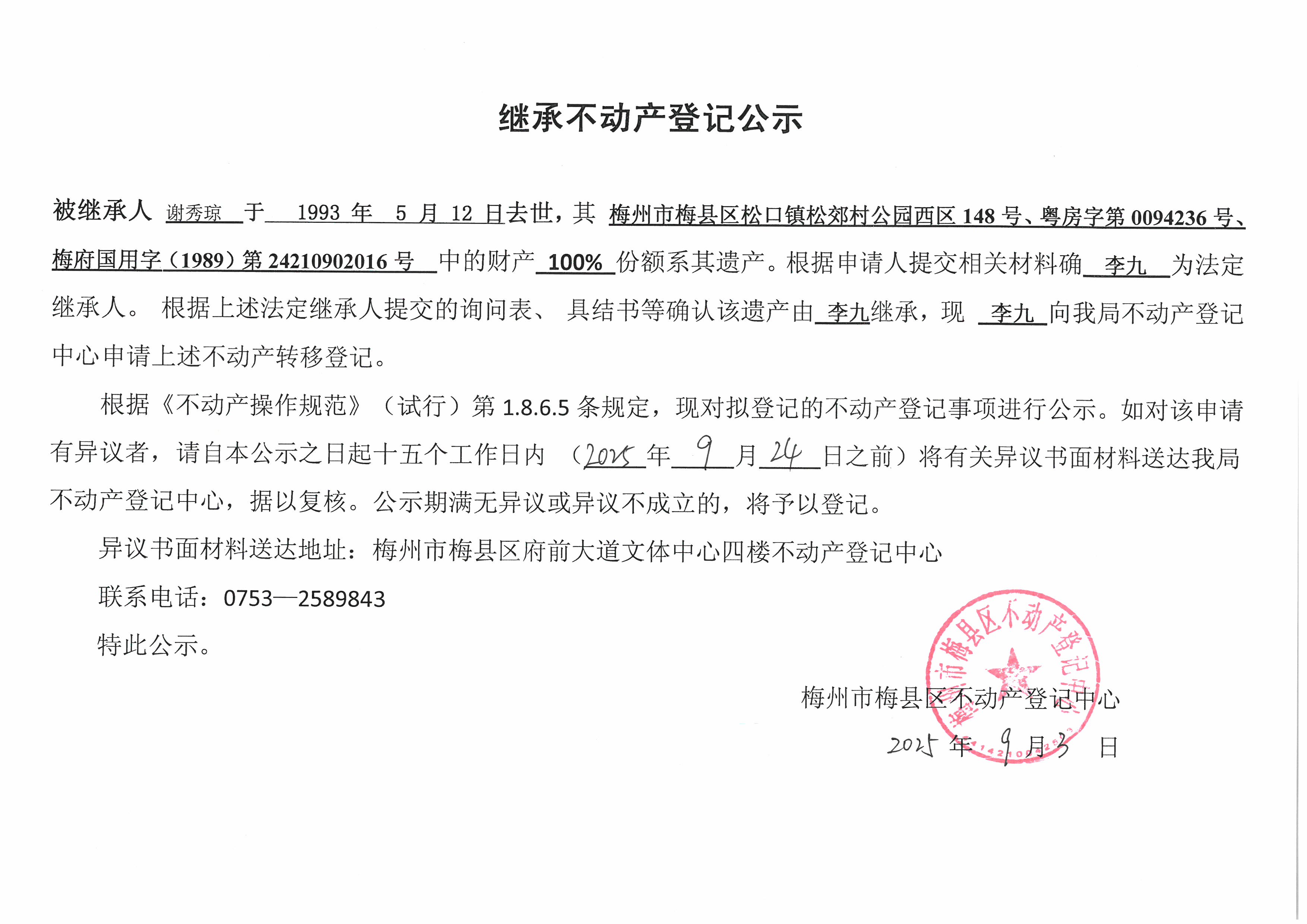 被继承人谢秀琼于1993年5月12日去世,其梅州市梅县区松口镇松郊村公园西区148号、粤房字第0094236号、梅府国用字(1989)第24210902016号中的财产100%份额系其遗产。根据申请人提交相关材料确李九为法定继承人。根据上述法定继承人提交的询问表、具结书等确认该遗产由李九继承,现李九向我局不动产登记中心申请上述不动产转移登记。