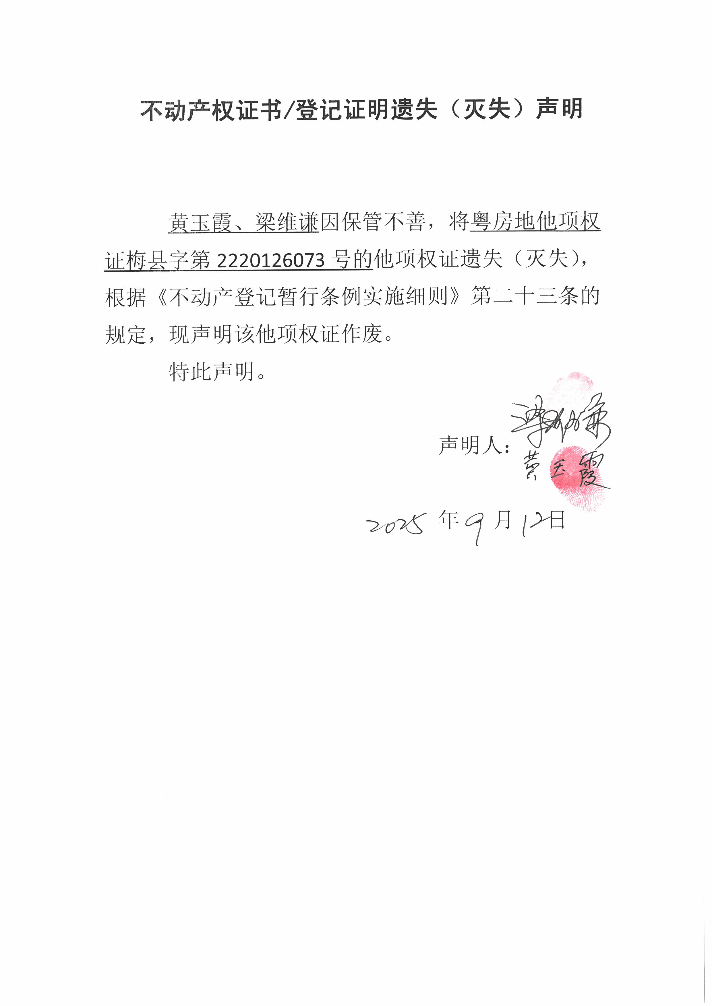 黄玉霞、梁维谦因保管不善,将粤房地他项权证梅县字第2220126073号的他项权证遗失(灭失),根据《不动产登记暂行条例实施细则》第二十三条的规定,现声明该他项权证作废。