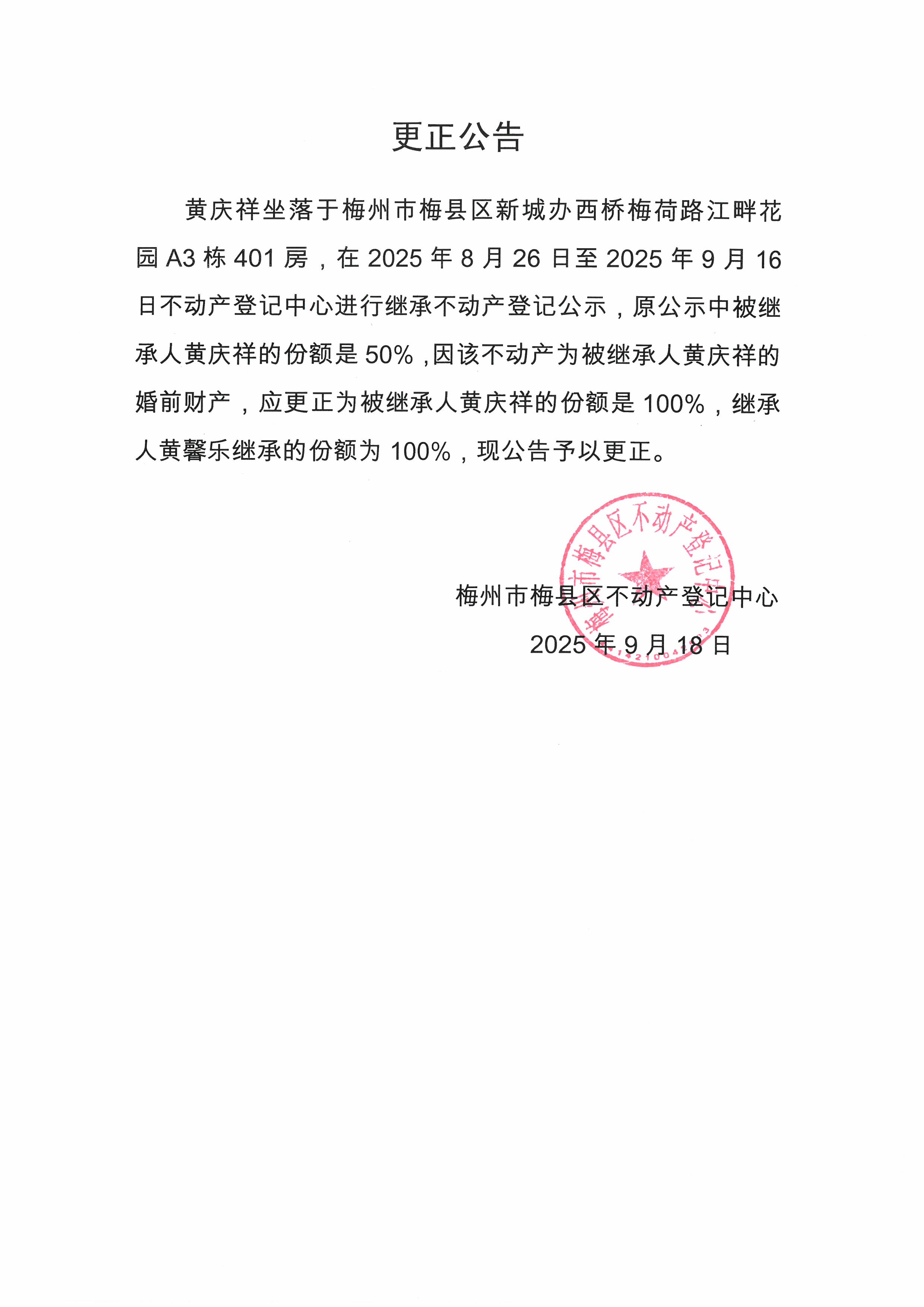 黄庆祥坐落于梅州市梅县区新城办西桥梅荷路江畔花园A3栋401房,在2025年8月26日至2025年9月16日不动产登记中心进行继承不动产登记公示,原公示中被继承人黄庆祥的份额是50%,因该不动产为被继承人黄庆祥的婚前财产,应更正为被继承人黄庆祥的份额是100%,继承人黄馨乐继承的份额为100%,现公告予以更正。