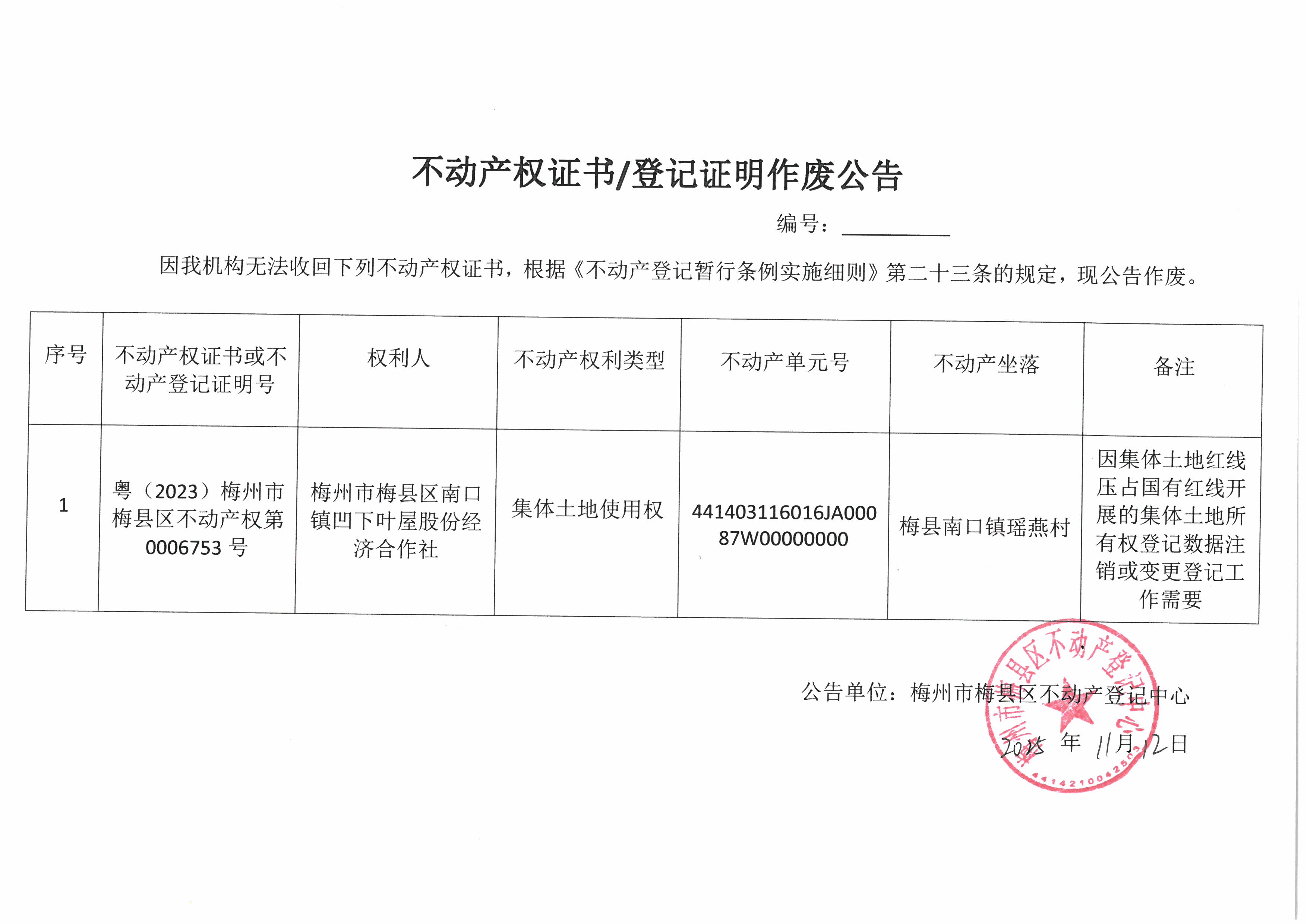 1 | 粤(2023)梅州市梅县区不动产权第0006753号 | 梅州市梅县区南口镇凹下叶屋股份经济合作社 | 集体土地使用权 | 441403116016JA00087W00000000 | 梅县南口镇瑶燕村 | 因集体土地红线压占国有红线开展的集体土地所有权登记数据注销或变更登记工作需要 |