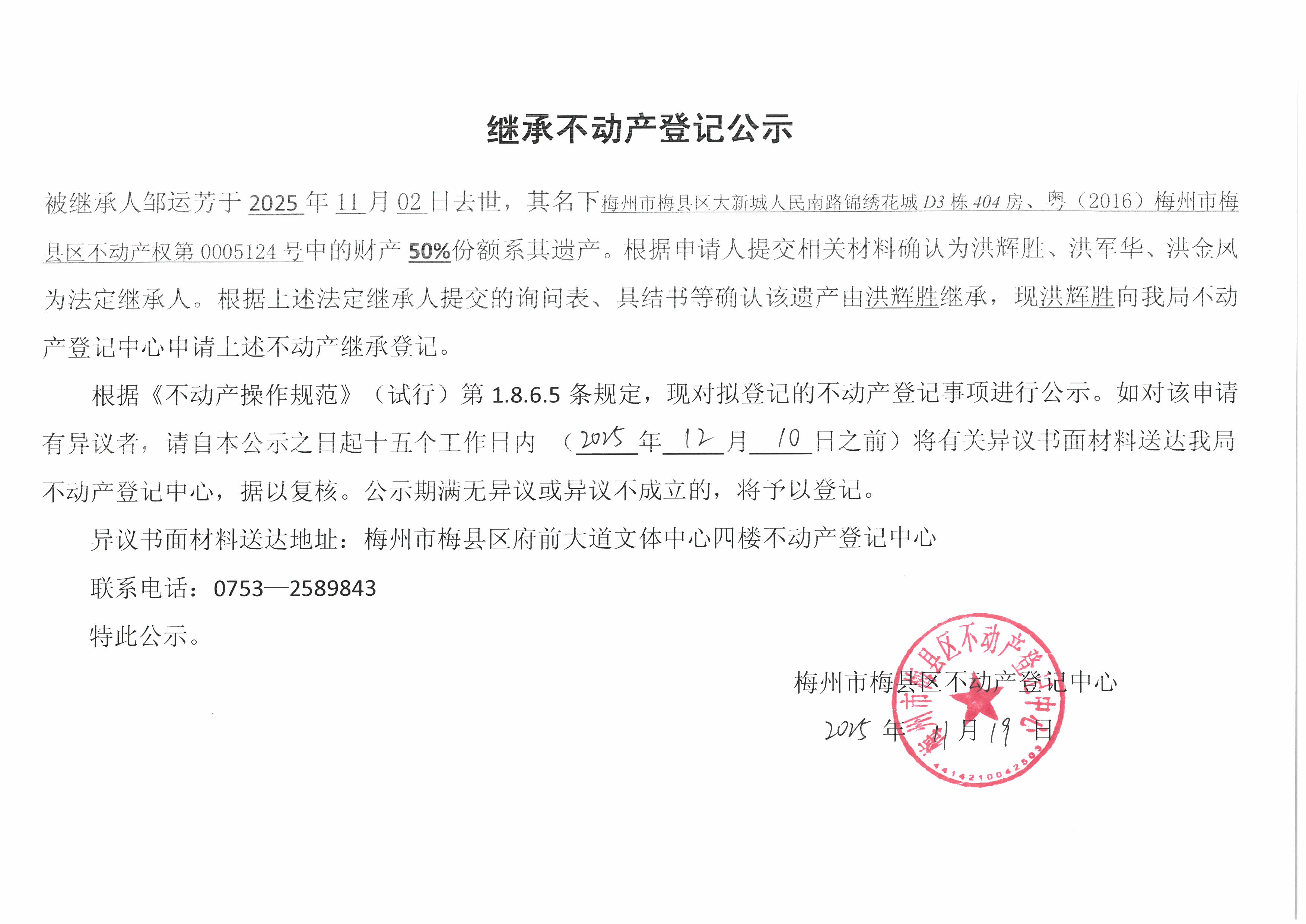被继承人邹运芳于2025年11月02日去世,其名下梅州市梅县区大新城人民南路锦绣花城D3栋404房、粤(2016)梅州市梅县区不动产权第0005124号中的财产50%份额系其遗产。根据中请人提交相关材料确认为洪辉胜、洪军华、洪金凤为法定继承人。根据上述法定继承人提交的询问表、具结书等确认该遗产由洪辉胜继承,现洪辉胜向我局不动产登记中心申请上述不动产继承登记。
