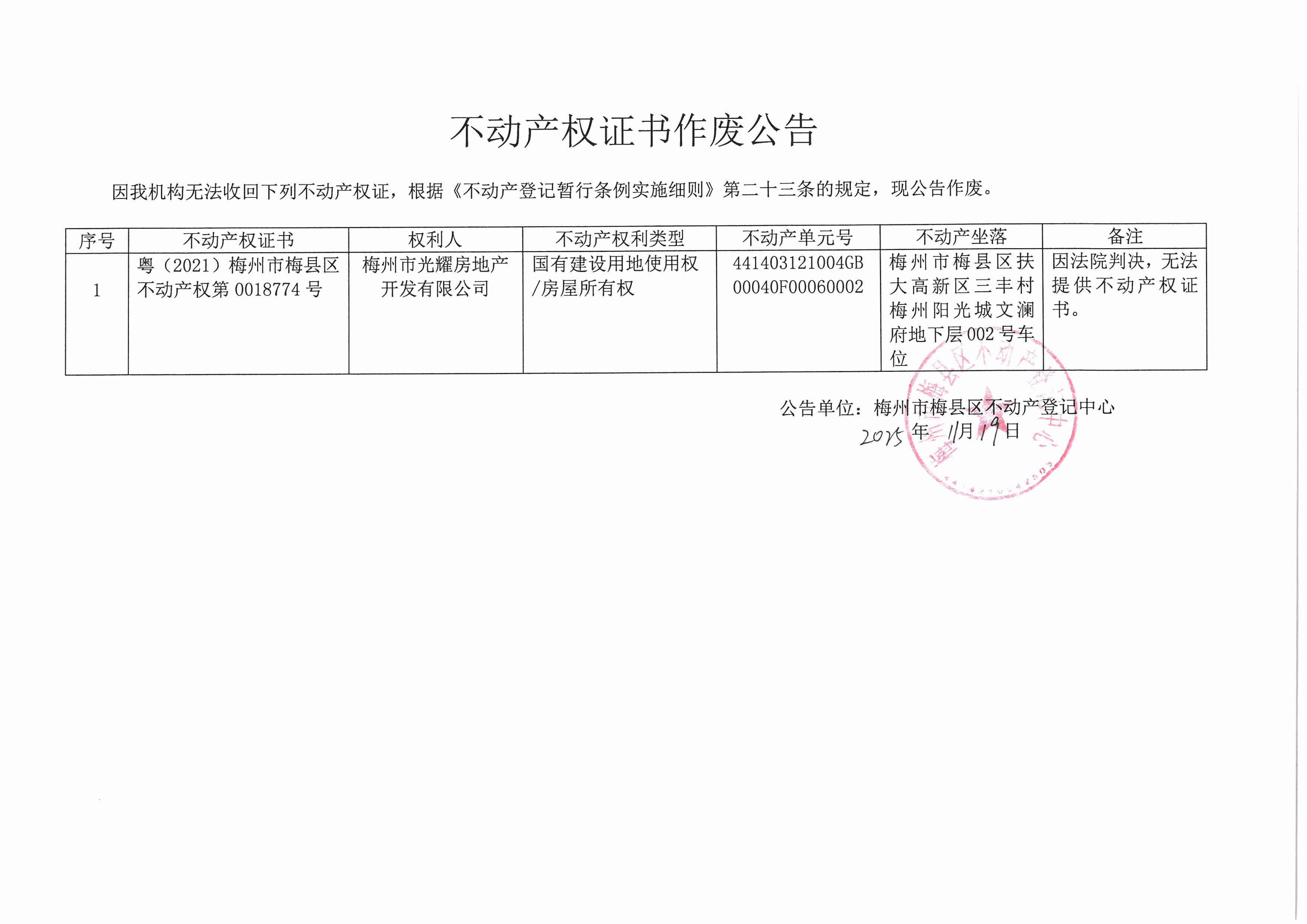 不动产登记中心登记公告(作废公告-梅州市光耀房地产开发有限公司-粤(2021)梅州市梅县区不动产权第0018774号)