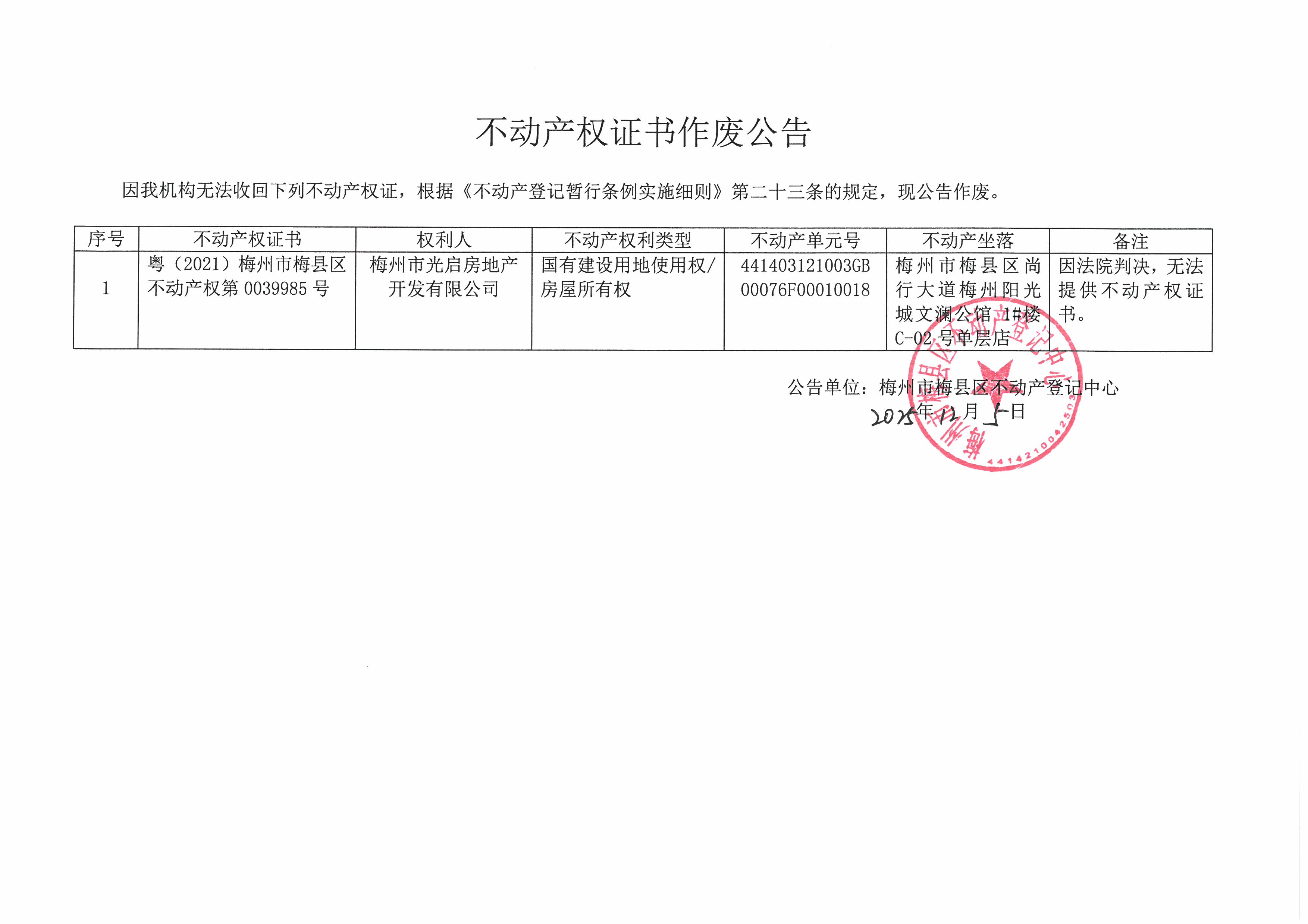 1 | 粤(2021)梅州市梅县区不动产权第0039985号 | 梅州市光启房地产开发有限公司 | 国有建设用地使用权/房屋所有权 | 441403121003GB00076F00010018 | 梅州市梅县区尚行大道梅州阳光城文澜公馆1#楼C-02号单层店 | 因法院判决,无法提供不动产权证书。 |