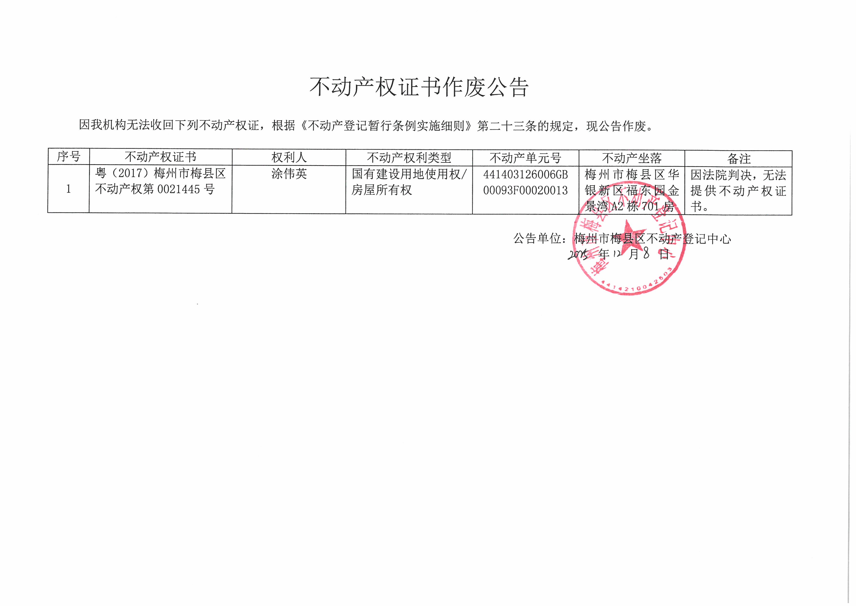 因我机构无法收回下列不动产权证,根据《不动产登记暂行条例实施细则》第二十三条的规定,现公告作废。