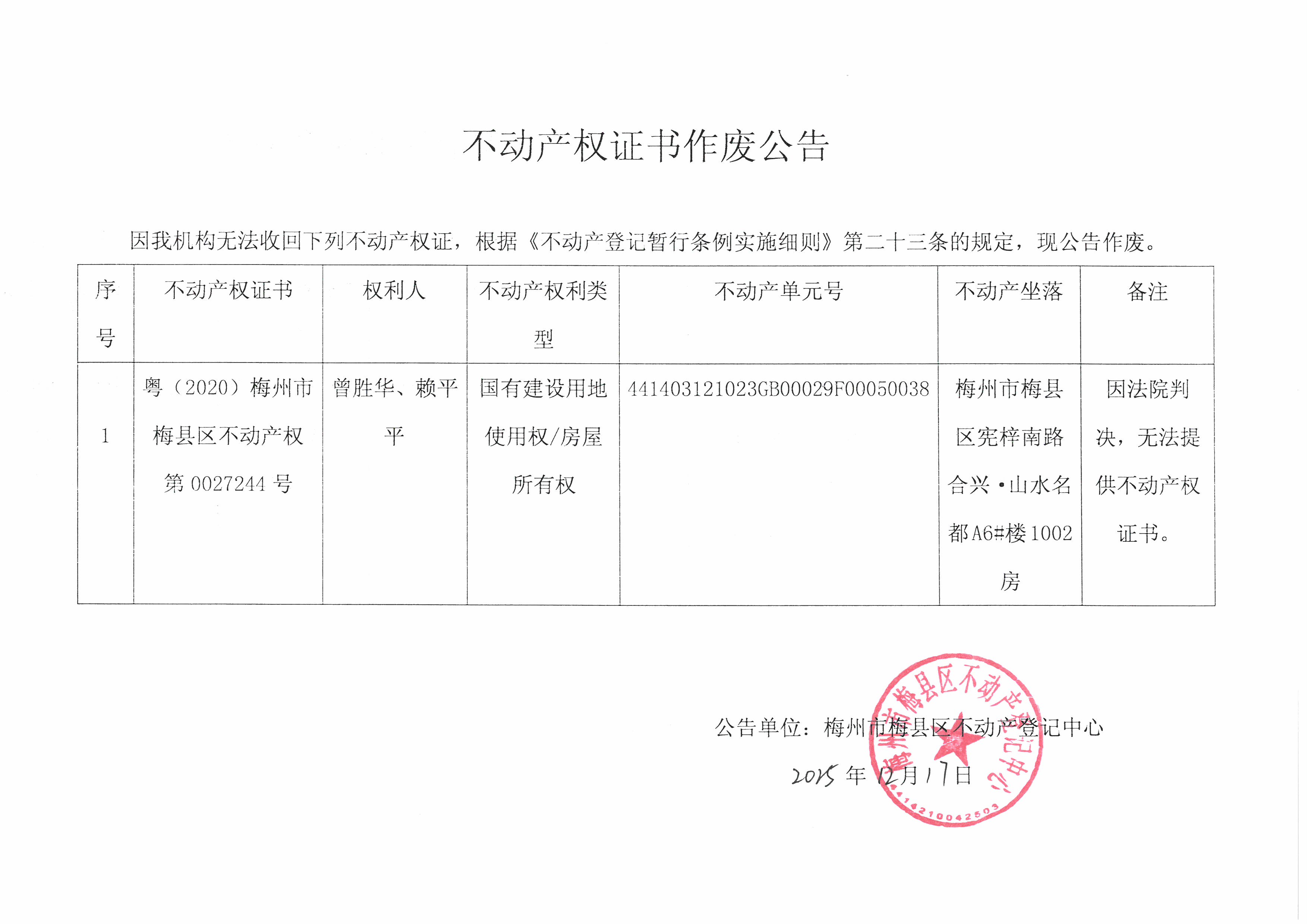公告单位:梅州市梅县区不动产登记中心