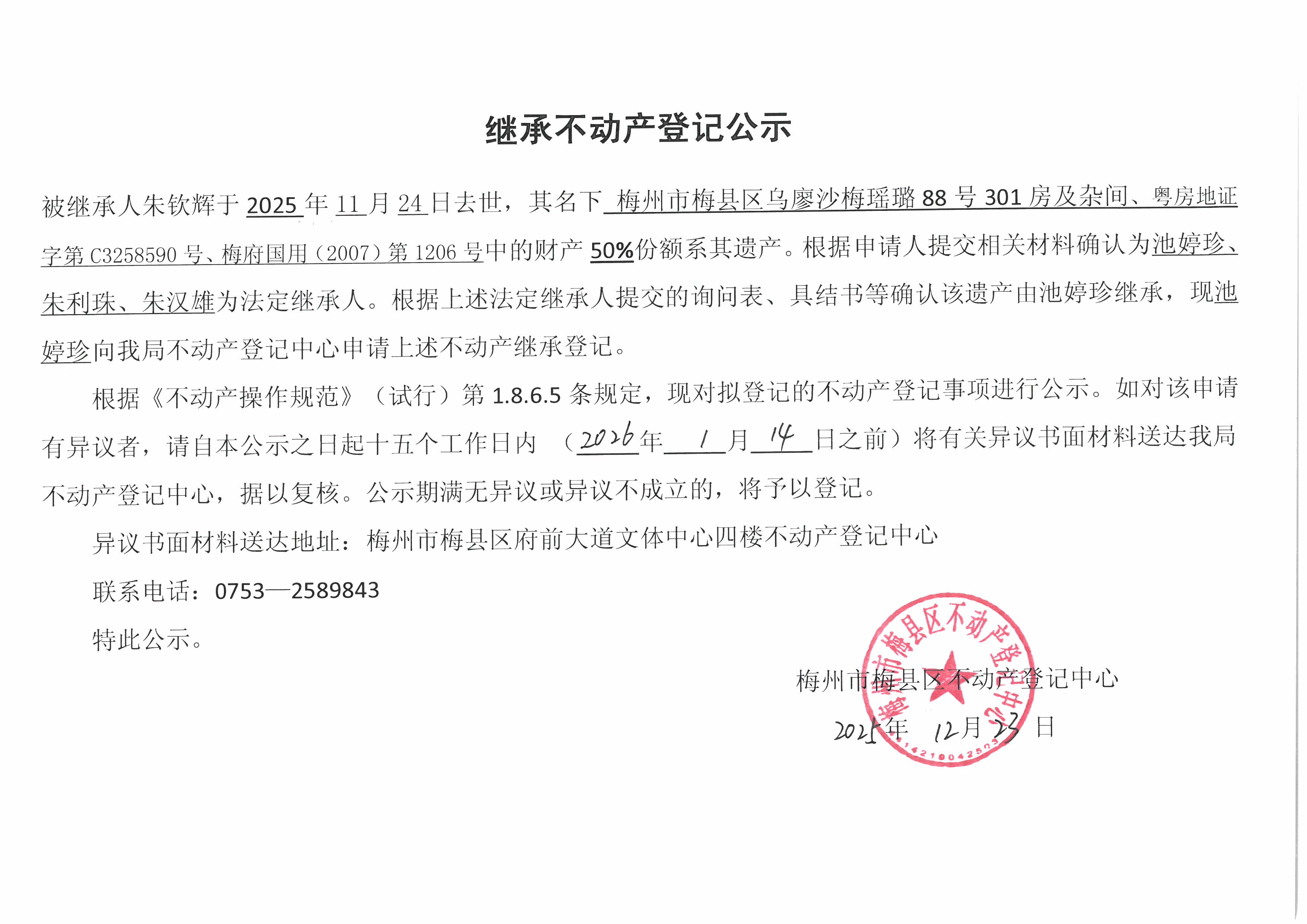 被继承人朱钦辉于2025年11月24日去世,其名下梅州市梅县区乌廖沙梅瑶璐88号301房及杂间、粤房地证字第C3258590号、梅府国用(2007)第1206号中的财产 50%份额系其遗产。根据申请人提交相关材料确认为池婷珍、朱利珠、朱汉雄为法定继承人。根据上述法定继承人提交的询问表、具结书等确认该遗产由池婷珍继承,现池婷珍向我局不动产登记中心申请上述不动产继承登记。