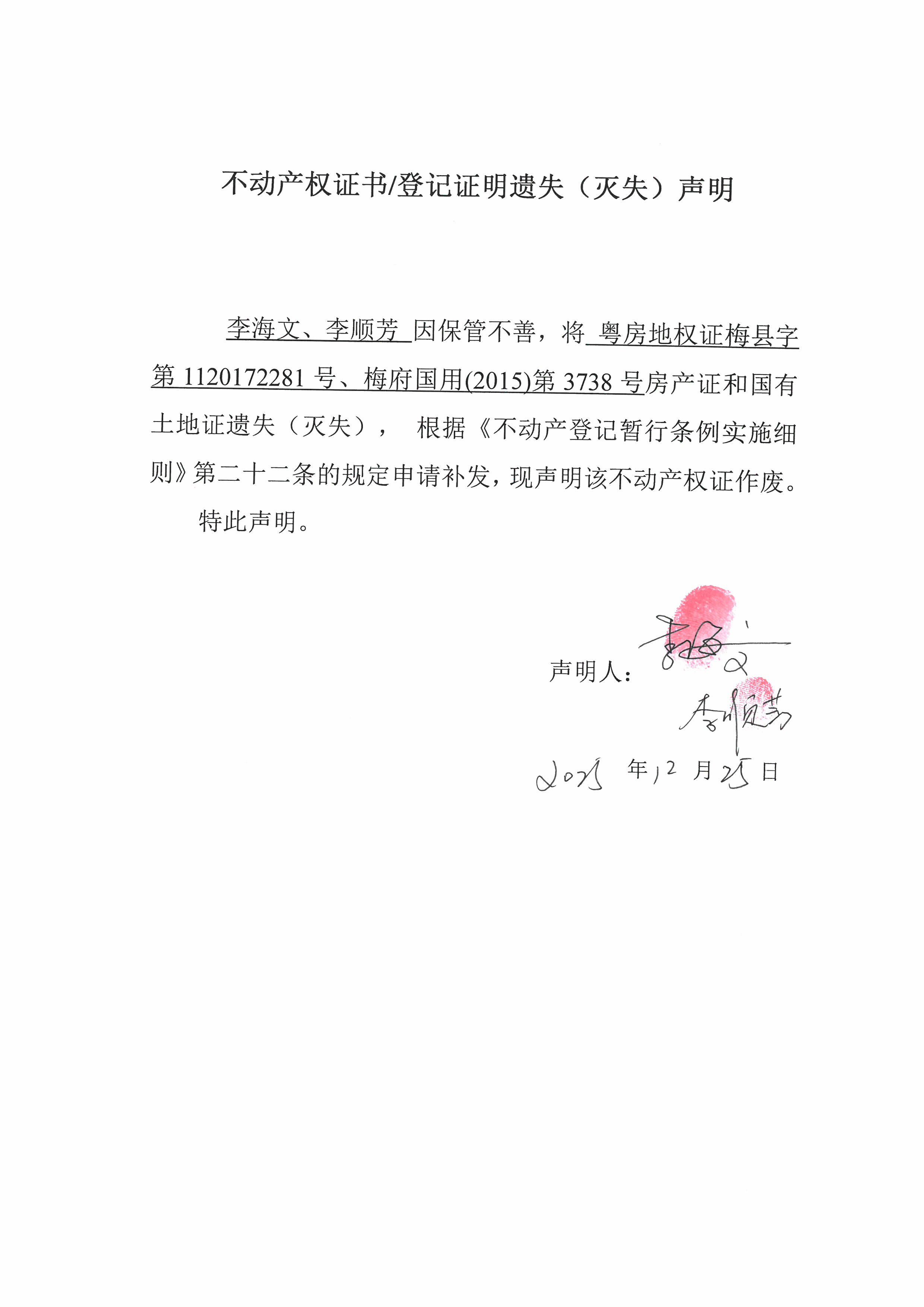 李海文、李顺芳因保管不善,将粤房地权证梅县字第1120172281号、梅府国用(2015)第3738号房产证和国有土地证遗失(灭失),根据《不动产登记暂行条例实施细则》第二十二条的规定申请补发,现声明该不动产权证作废,