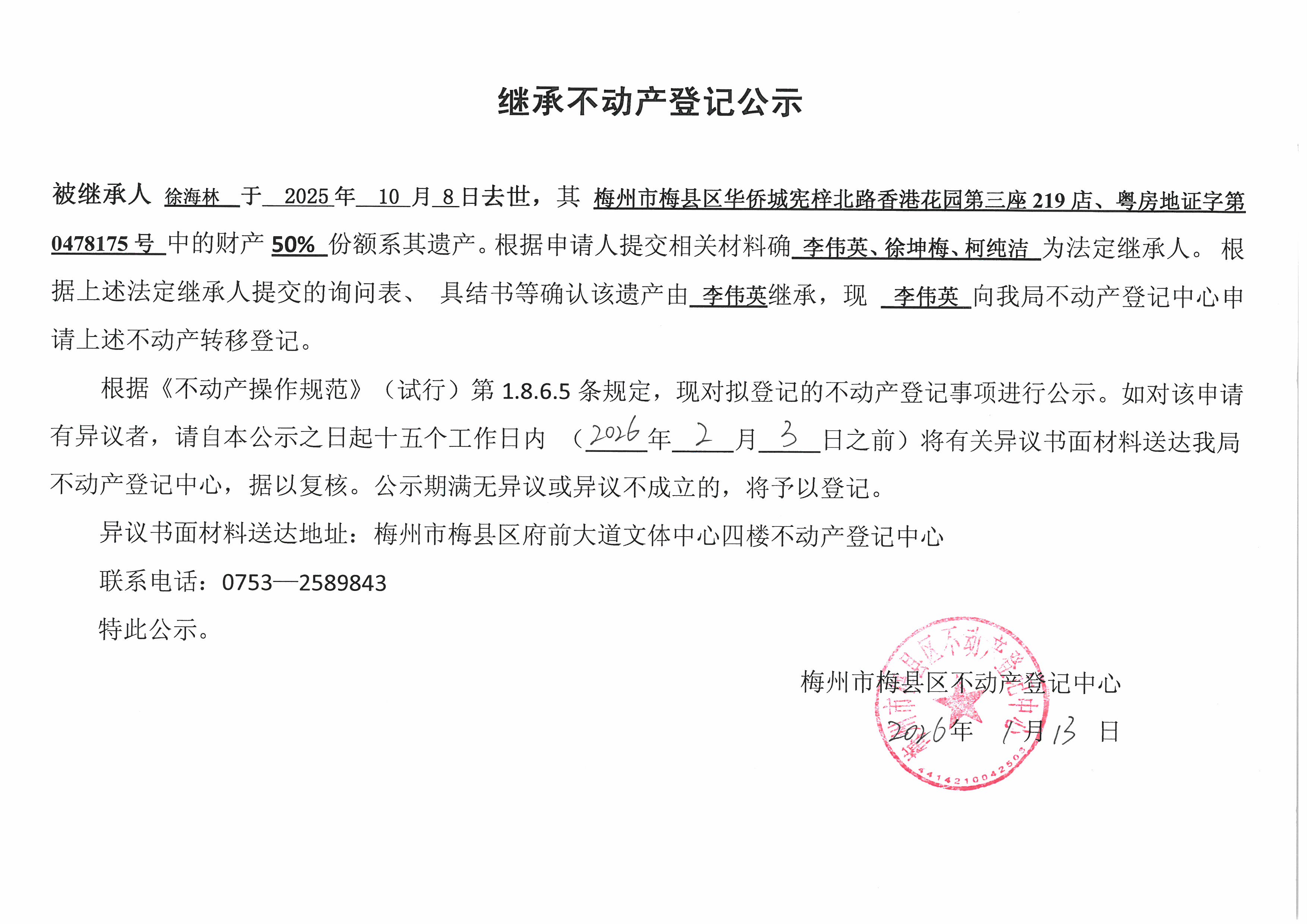 被继承人徐海林于2025年10月8日去世,其梅州市梅县区华侨城北路香港花园第三座219店、粤房地证字第0478175号中的财产50%份额系其遗产。根据申请人提交相关材料确李伟英、徐坤梅、柯纯洁为法定继承人。根据上述法定继承人提交的询问表、具结书等确认该遗产由李伟英继承,现李伟英向我局不动产登记中心申请上述不动产转移登记。