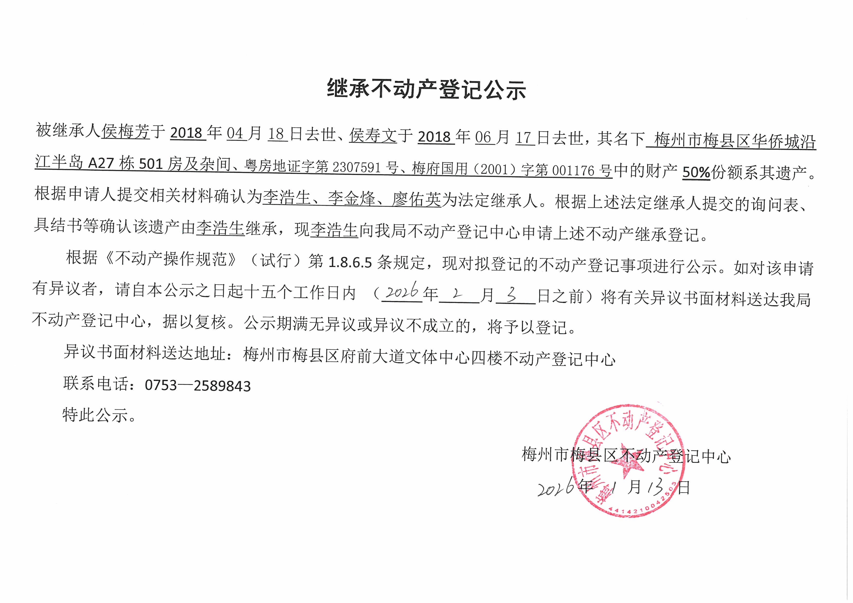 被继承人侯梅芳于2018年04月18日去世、侯寿文于2018年06月17日去世,其名下梅州市梅县区华侨城沿江半岛A27栋501房及杂间、粤房地证字第2307591号、梅府国用(2001)字第001176号中的财产50%份额系其遗产根据申请人提交相关材料确认为李浩生、李金烽、廖佑英为法定继承人。根据上述法定继承人提交的询问表,具结书等确认该遗产由李浩生继承,现李浩生向我局不动产登记中心申请上述不动产继承登记。