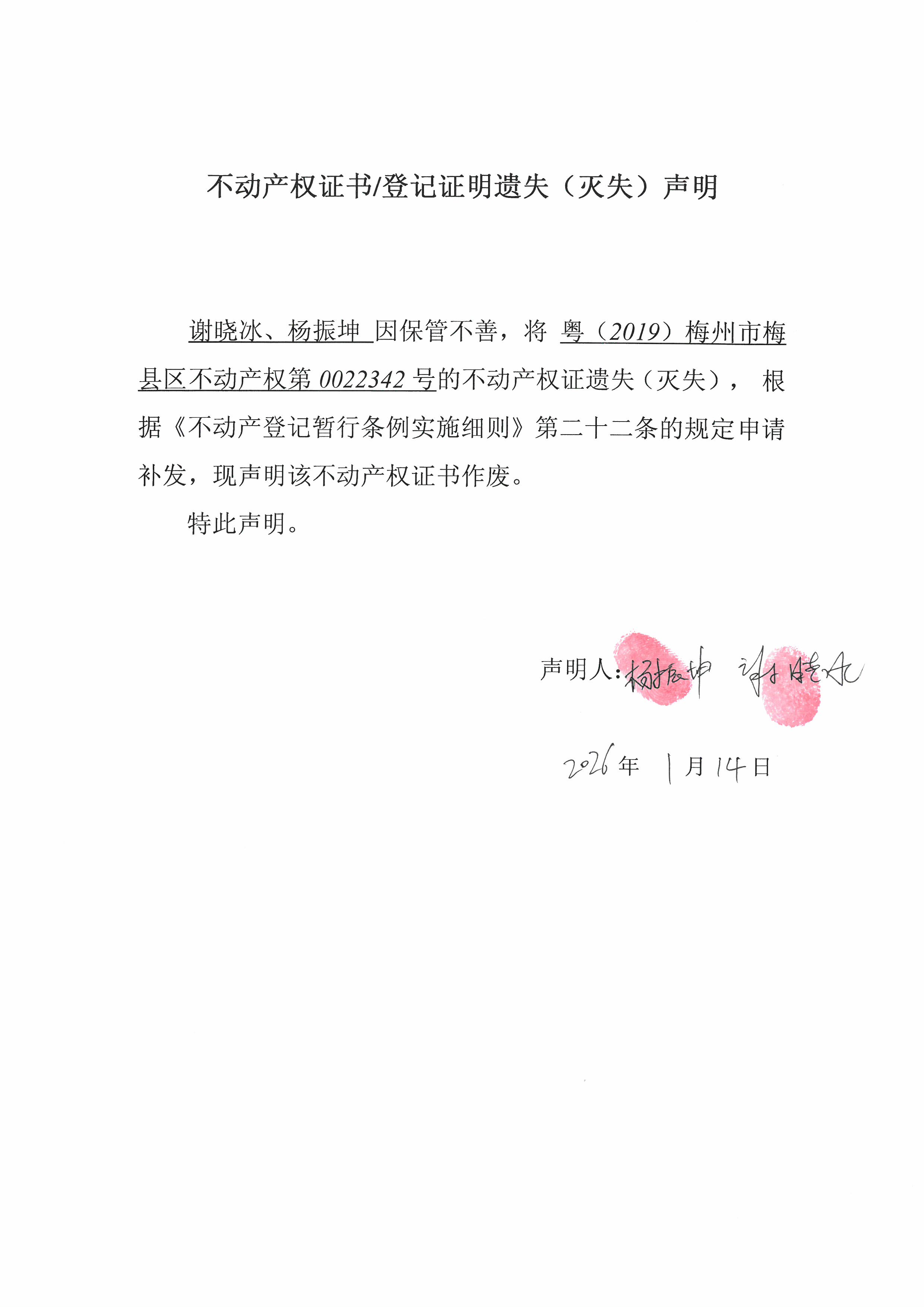 谢晓冰、杨振坤因保管不善,将粤(2019)梅州市梅县区不动产权第0022342号的不动产权证遗失(灭失),根据《不动产登记暂行条例实施细则》第二十二条的规定申请补发,现声明该不动产权证书作废。
