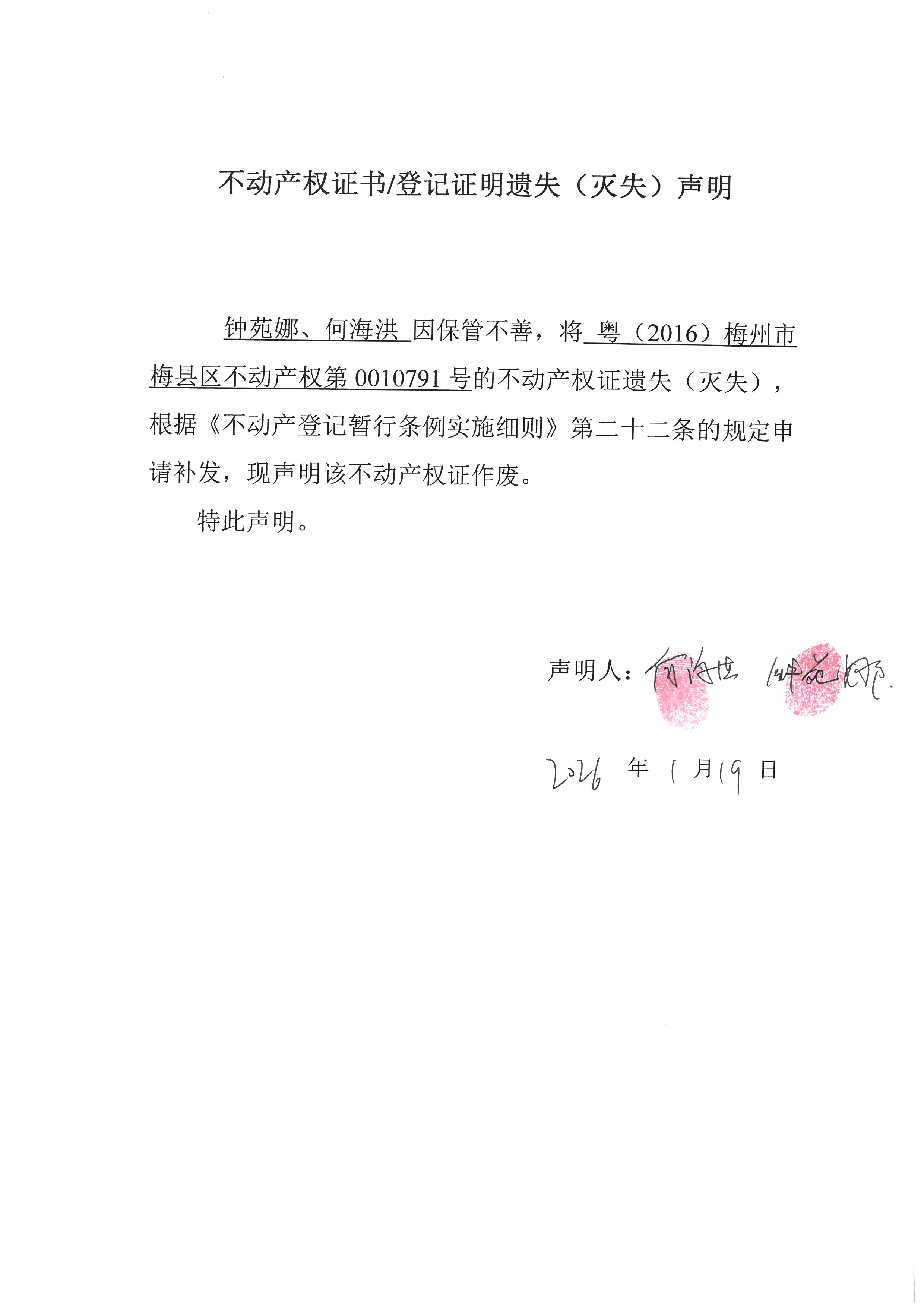 钟苑娜、何海洪因保管不善,将粤(2016)梅州市梅县区不动产权第0010791号的不动产权证遗失(灭失)根据《不动产登记暂行条例实施细则》第二十二条的规定申请补发,现声明该不动产权证作废。