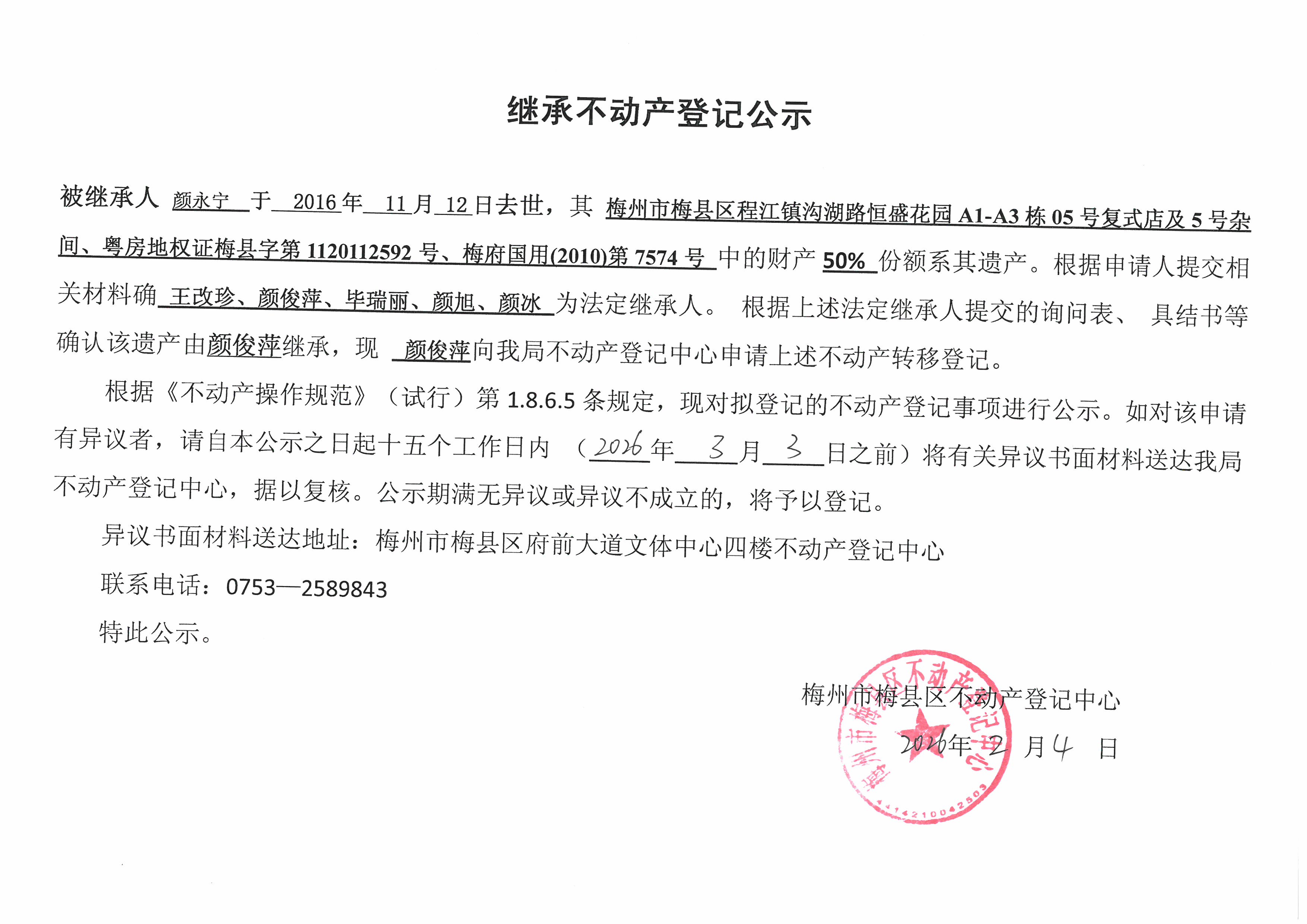 被继承人颜永宁于2016年11月12日去世,其梅州市梅县区程江镇沟湖路恒盛花园A1-A3栋05号复式店及5号杂间、粤房地权证梅县字第1120112592号、梅府国用(2010)第7574号中的财产50%份额系其遗产。根据申请人提交相关材料确认王改珍、颜俊萍、毕瑞丽、颜旭、颜冰为法定继承人。根据上述法定继承人提交的询问表、具结书等确认该遗产由颜俊萍继承,现颜俊萍向我局不动产登记中心申请上述不动产转移记。